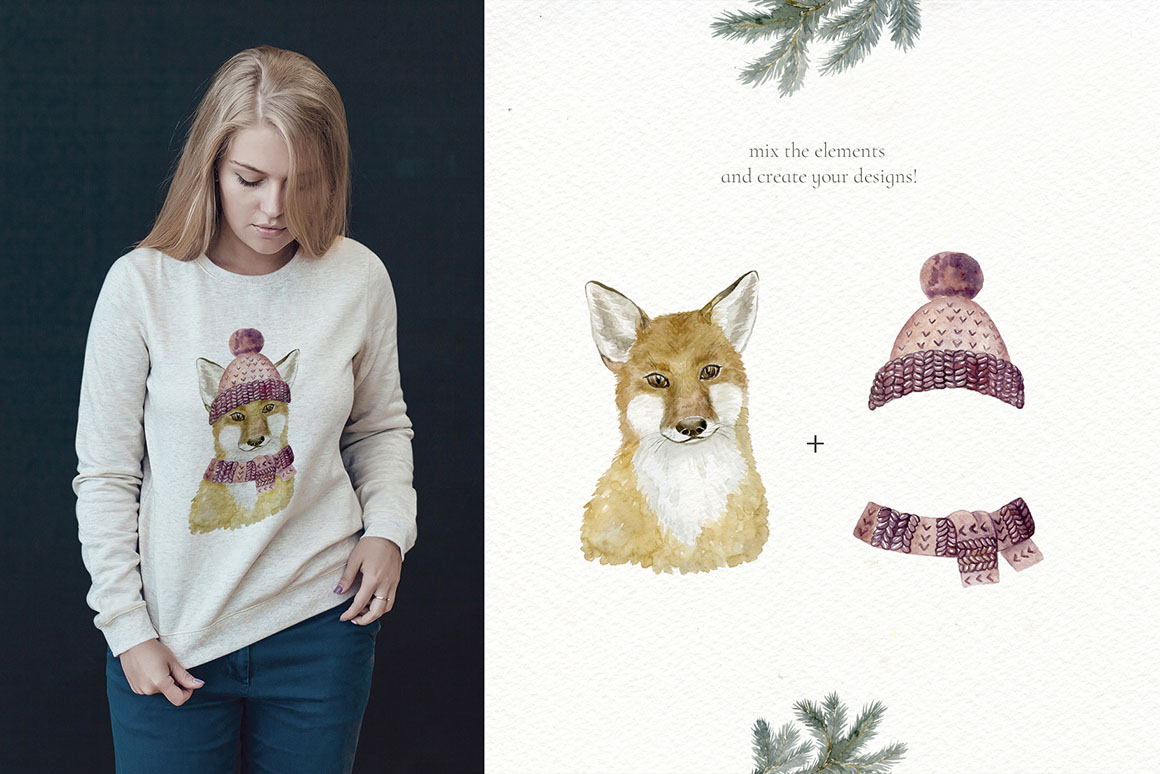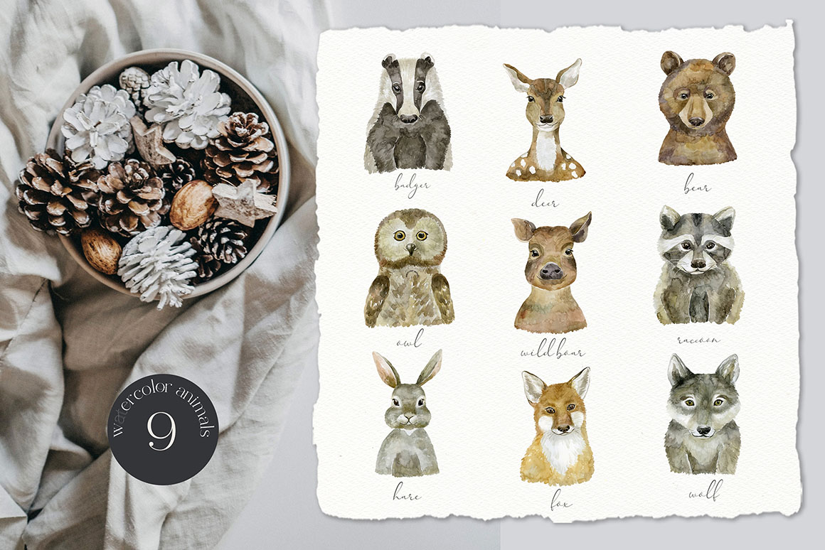 “Forest Animals. Character Creator Kit.” Watercolor handpainting with Animals and Floral Design Elements. It’s included a lot of Frames, Wreaths, Bouquets, pre-made Animals designs, patterns that are great for t-shirt, fabric, posters, holiday decor, invitation, stickers, children room decoration, wedding design, packaging, greeting cards and more.