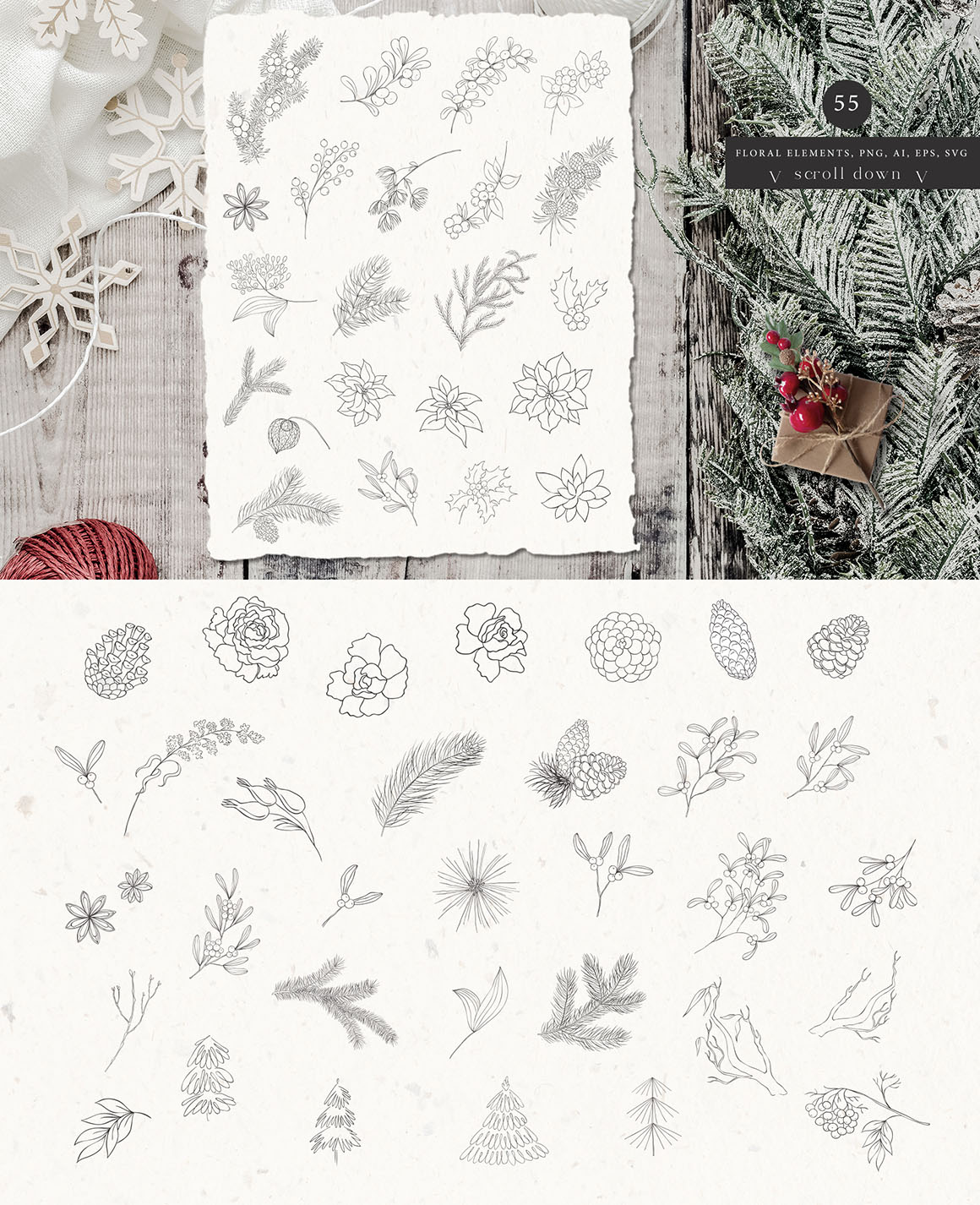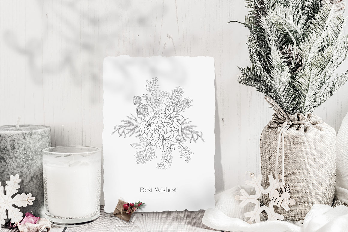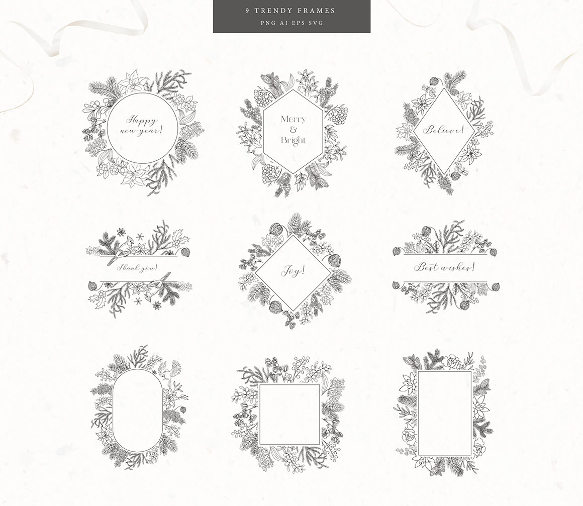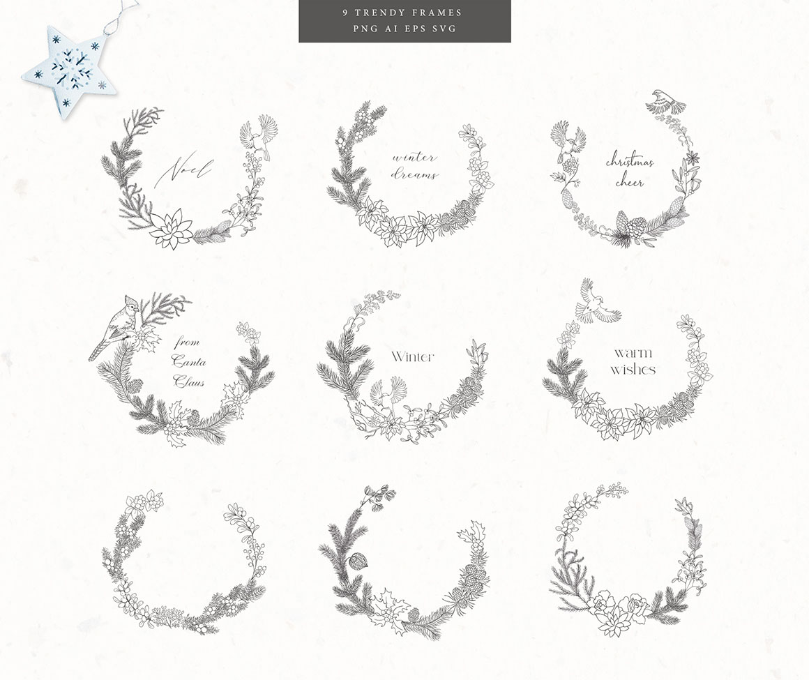 Here is a new Christmas and Winter collection with Hand Drawn Floral Botanical Design Elements of winter plants in modern line art style, Frames, Wreaths, Bouquets, that are great for logo, branding, decor, decoration, invitation, wedding design, packaging, greeting cards and more.