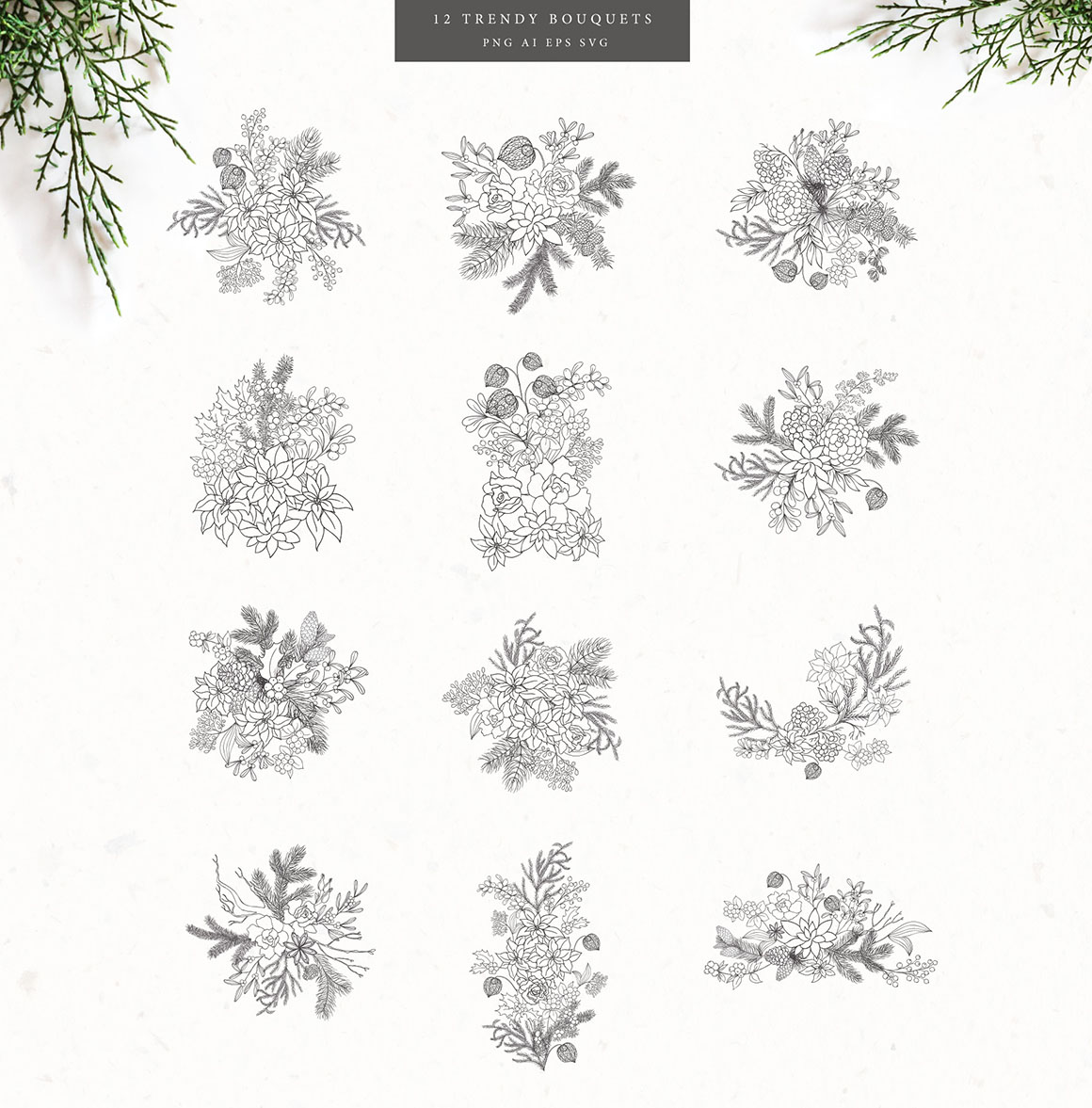 - 12 Bouquets, as AI, EPS, SVG separated PNG (5000×5000 px, 300dpi) file