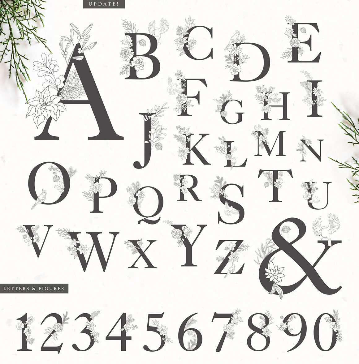 - 27 Floral letters and ampersand, as AI, EPS, SVG separated PNG (5000×5000 px, 300dpi) file