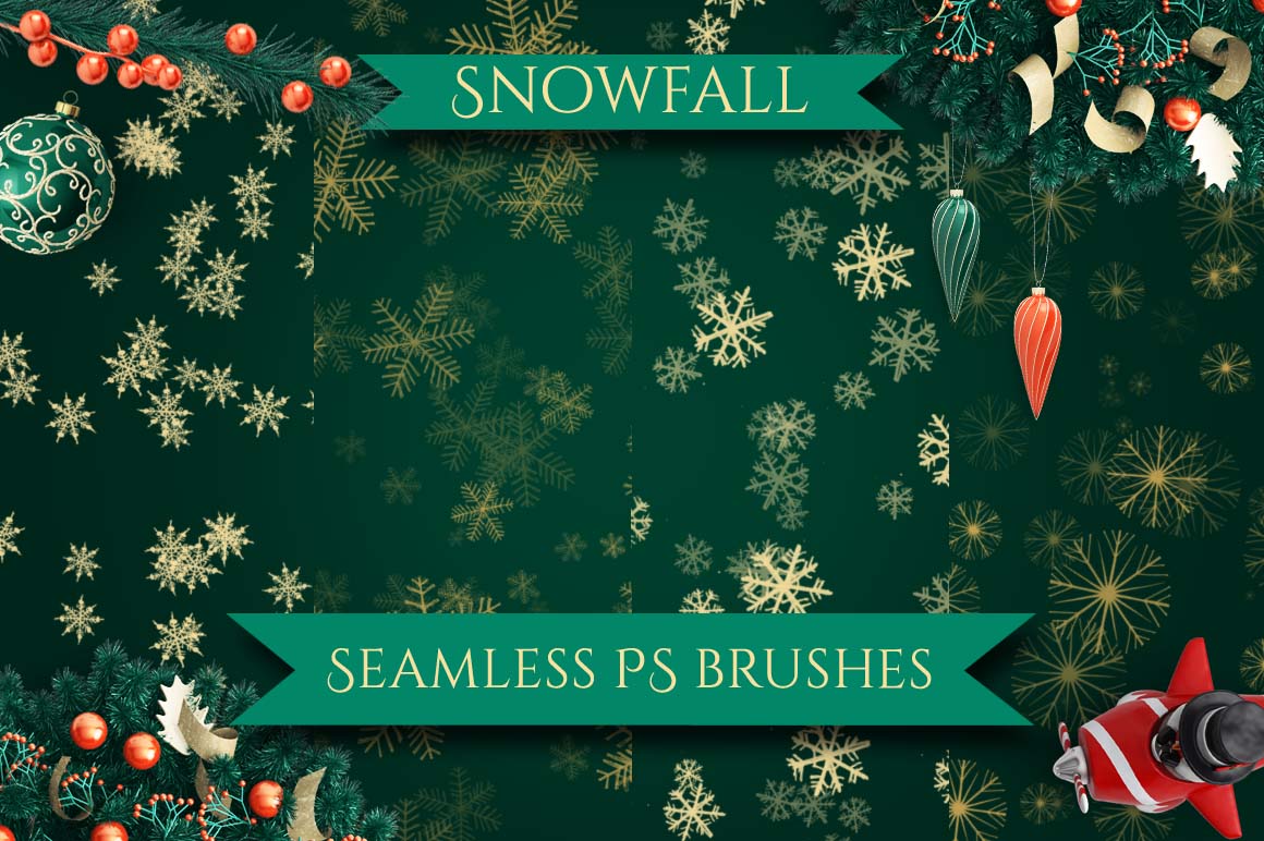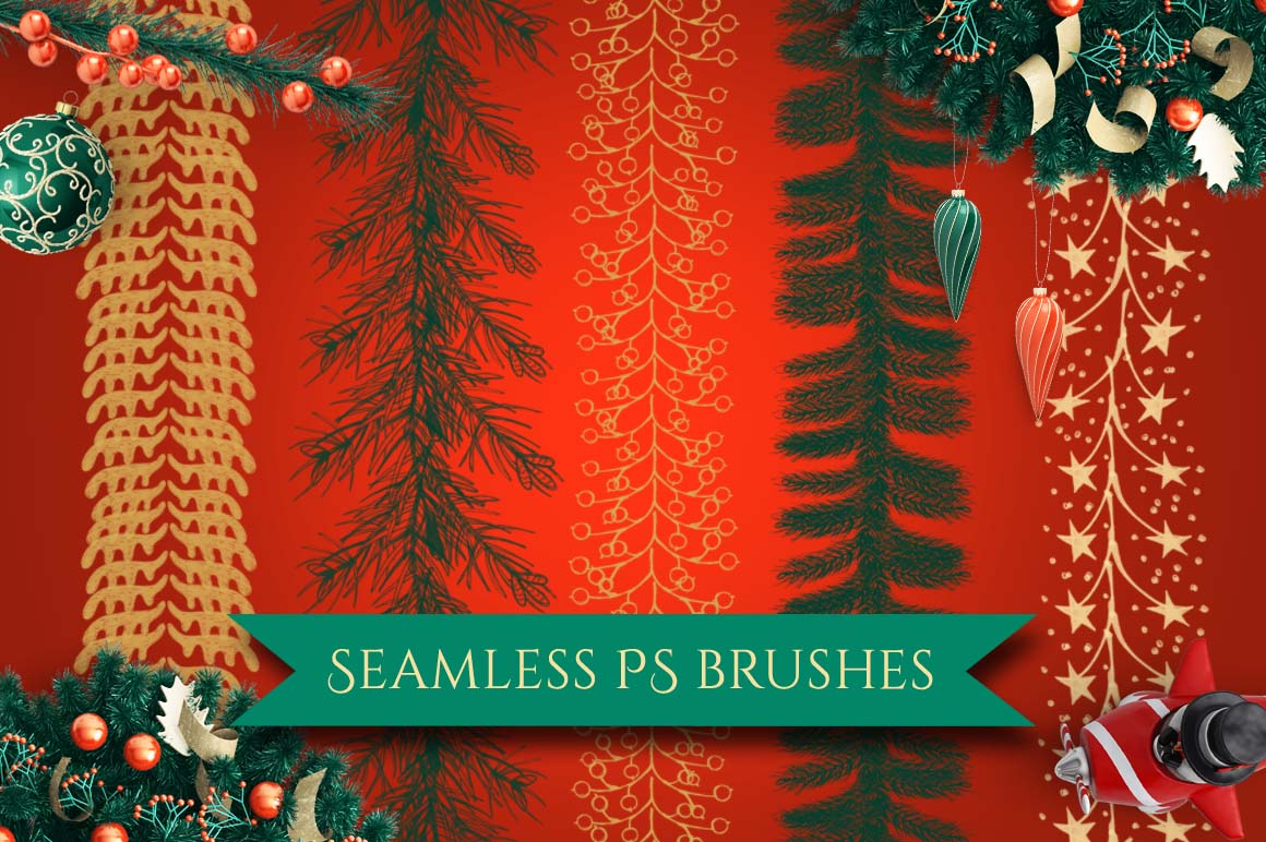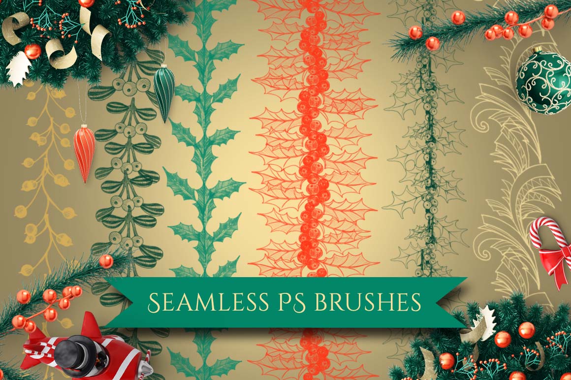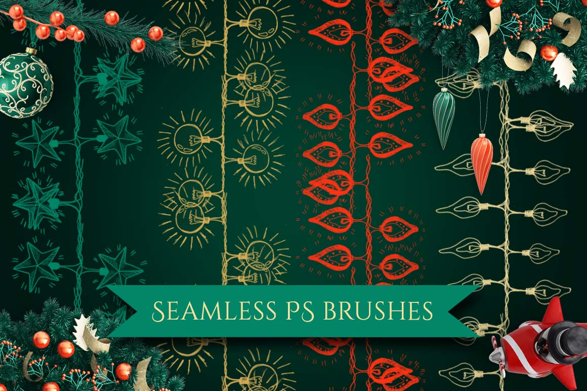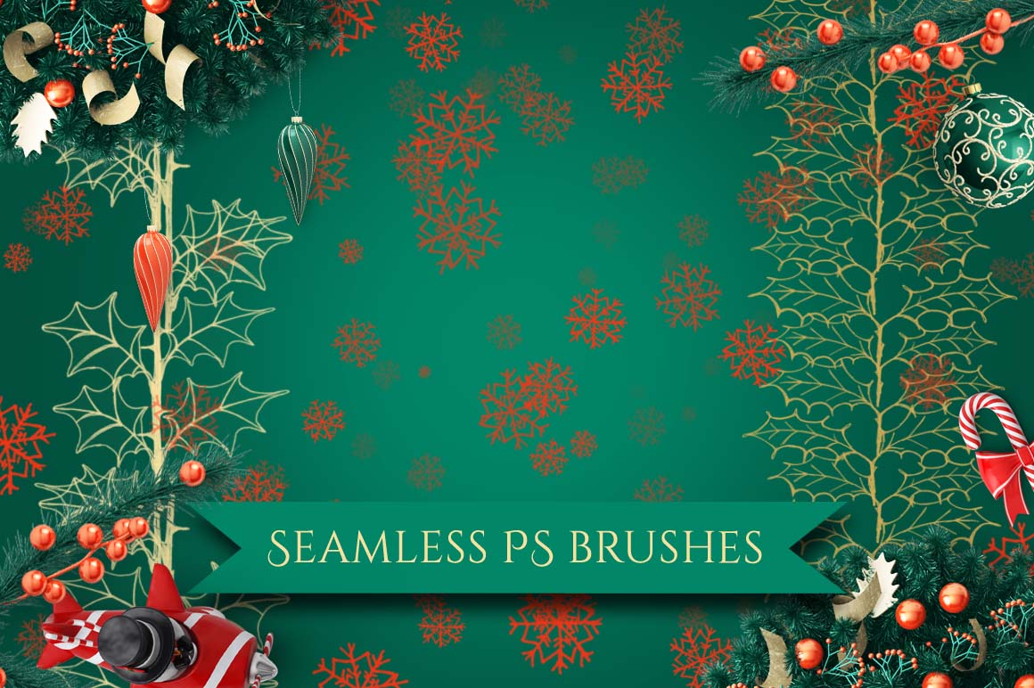 I am happy to present you this set of Christmas decorations hand painted seamless pattern brushes for Photoshop!