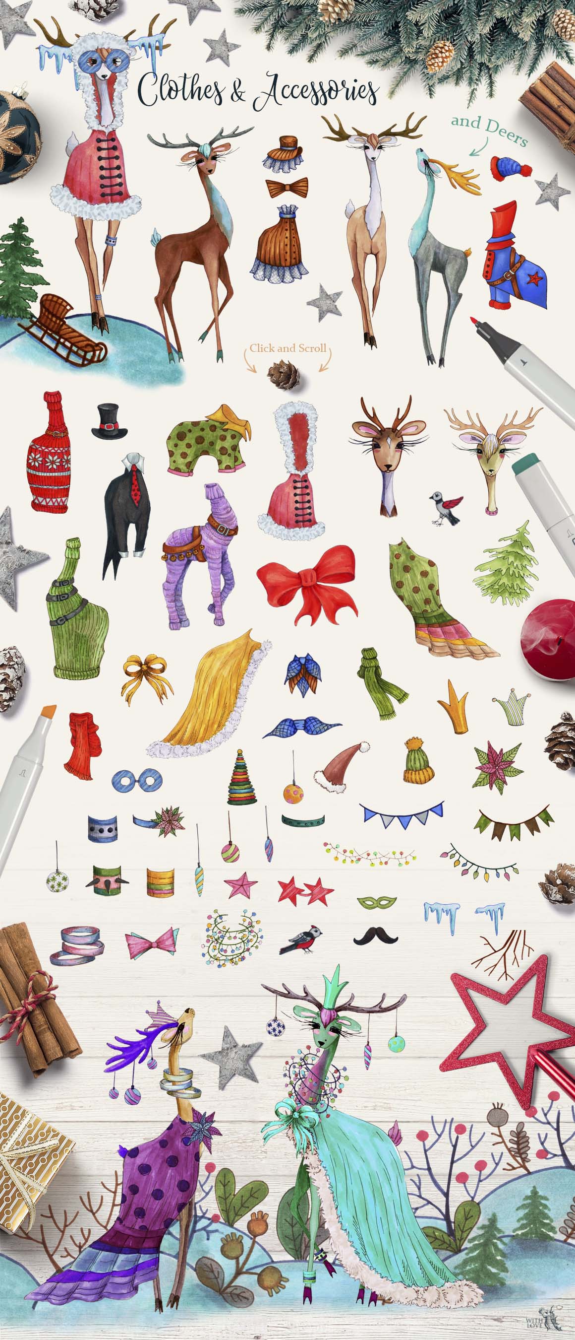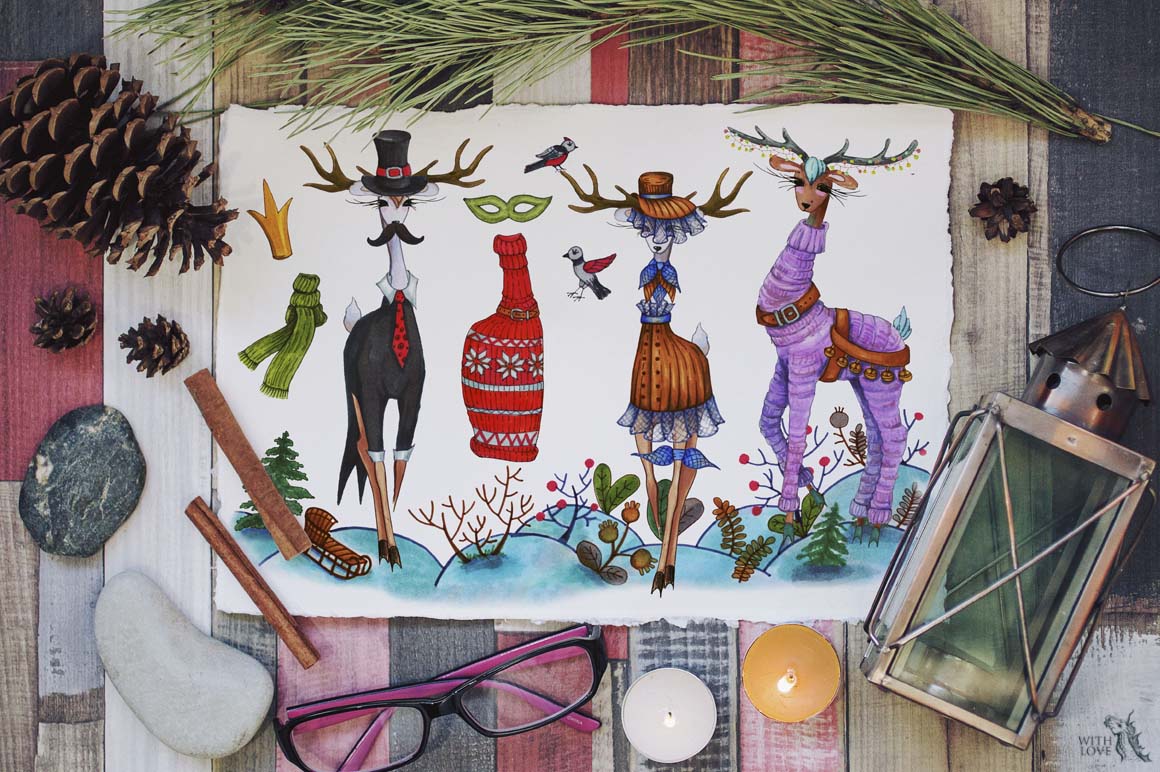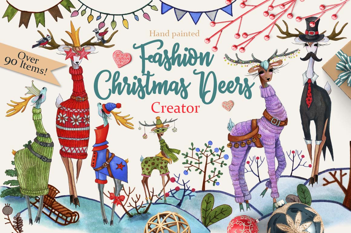 Introducing the Fashion Christmas Deers Creator! This marker collection consists of many elements, with which you can create amazing and cute animals. It’s super fun to use and with just a few clicks, you’ll be creating unique, hand drawn custom deers! 🙂 Fashionable and stylish New Year’s deers are perfect for decorating postcards and invitations to your party. Also with this you can create funny avatars, business cards, stickers and anything!