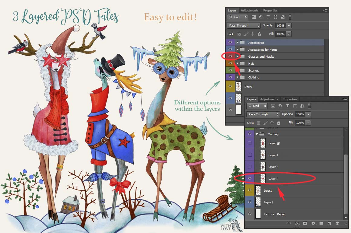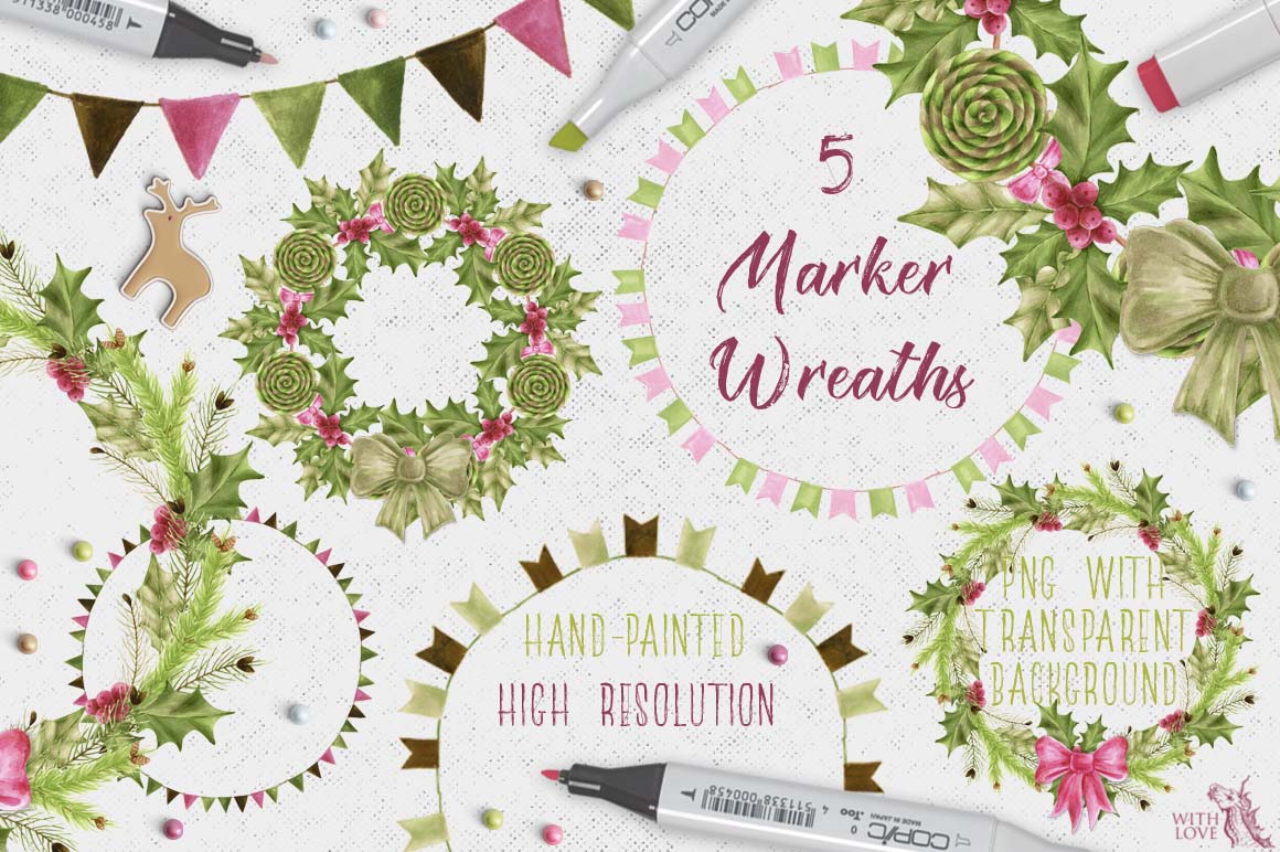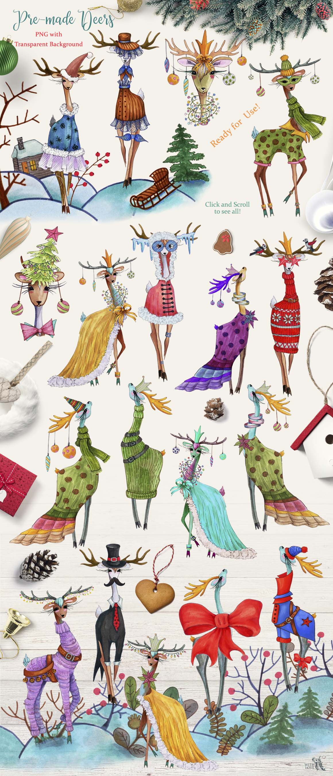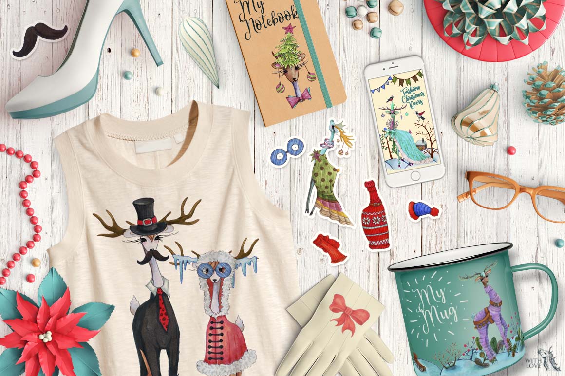 Introducing the Fashion Christmas Deers Creator! This marker collection consists of many elements, with which you can create amazing and cute animals. It’s super fun to use and with just a few clicks, you’ll be creating unique, hand drawn custom deers! 🙂 Fashionable and stylish New Year’s deers are perfect for decorating postcards and invitations to your party. Also with this you can create funny avatars, business cards, stickers and anything!