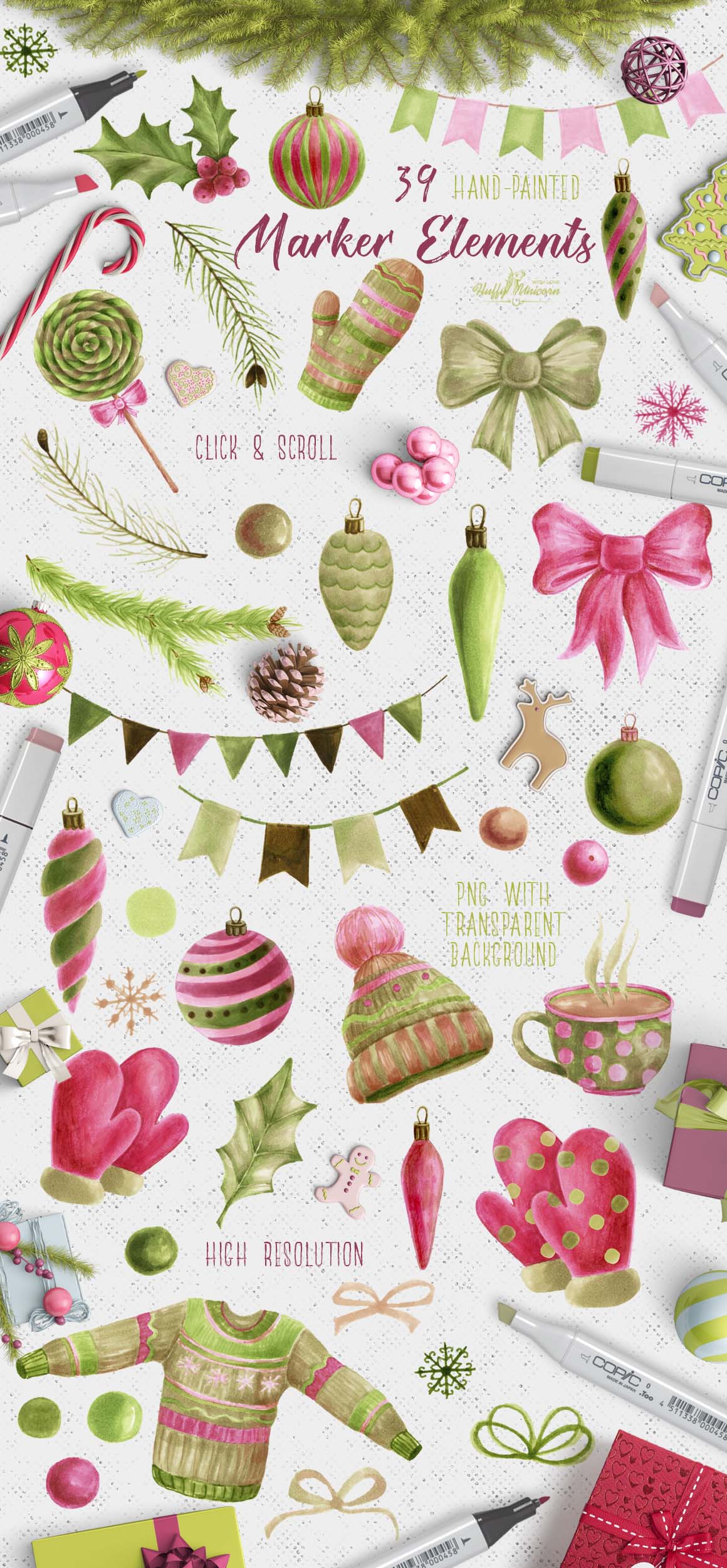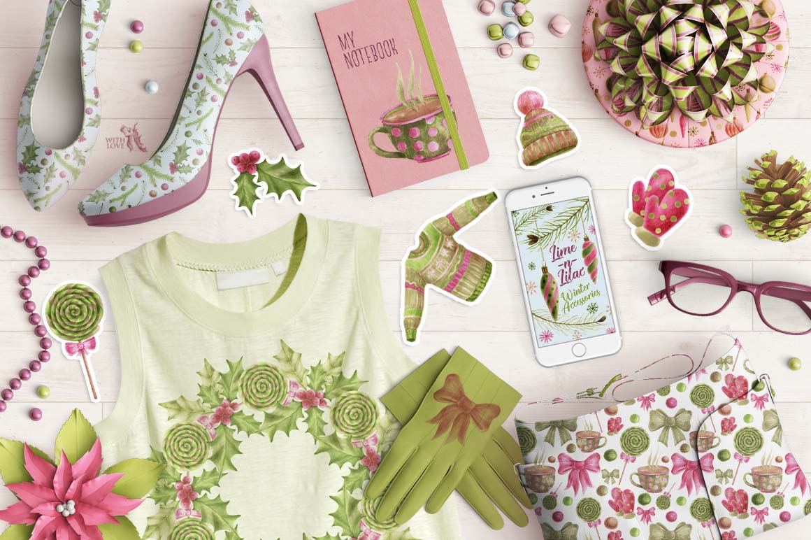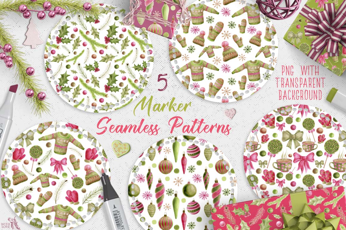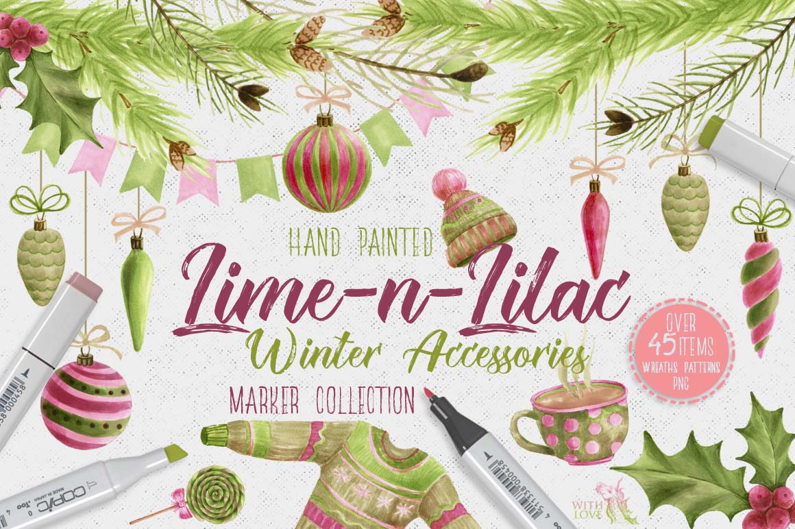 This is winter collection, containing 49 graphic elements, include: Christmas decorations, winter clothes (sweater, knitted cap and mittens), pine branches, holly, cup of cocoa .. and other necessary winter accessories. This set also contains seamless patterns and amazing wreaths. Hand-drawn with markers and with love. Use it for a wide range of products such as branding projects, fabrics, packaging, invitations, fashion apparel, posters, postcards, wrapping paper, printables or just try them as web backgrounds with great results!
