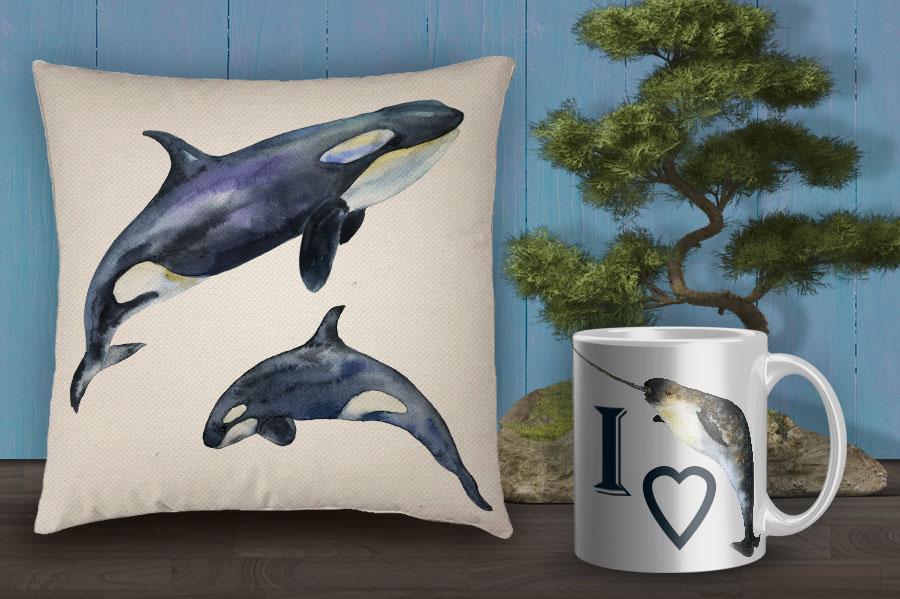 - 7 PNG 300dpi (~3500x1700pixels) marine mammals (whales, killer whales, dolphin, sperm whale, narwhal)
