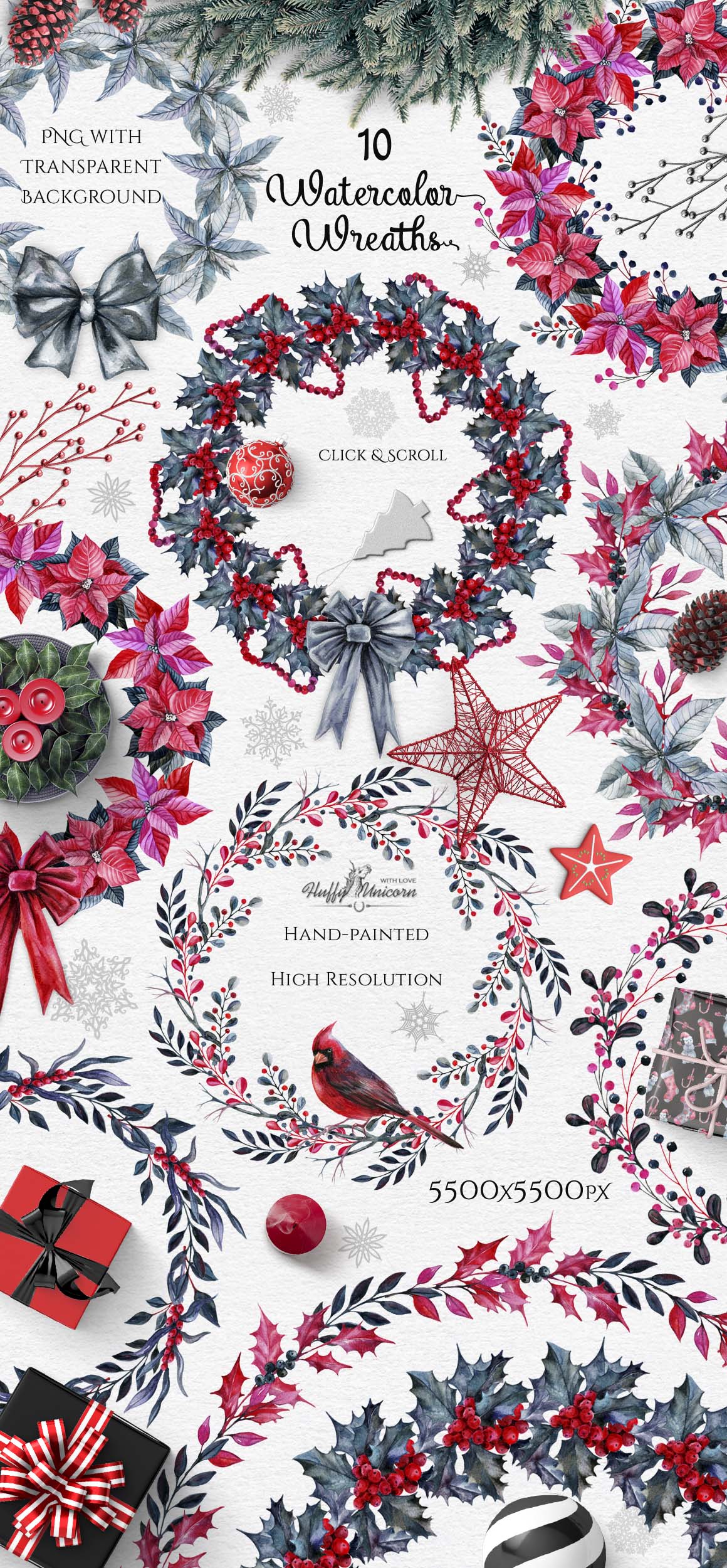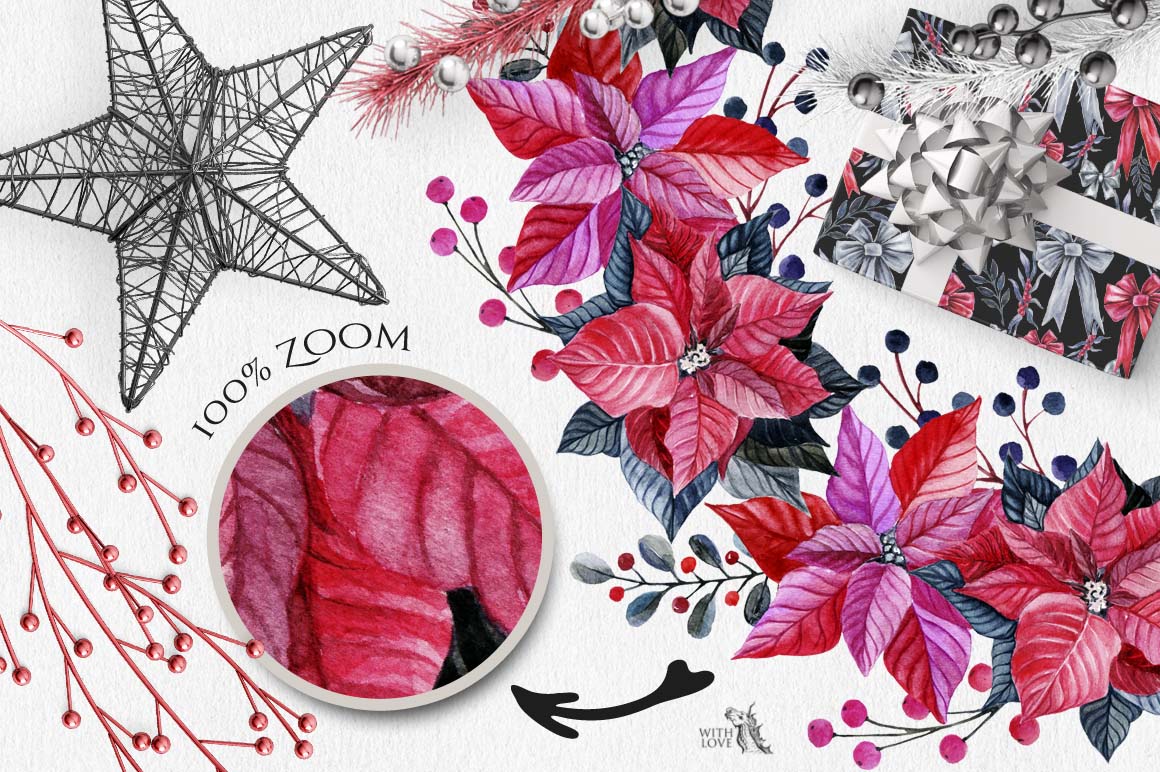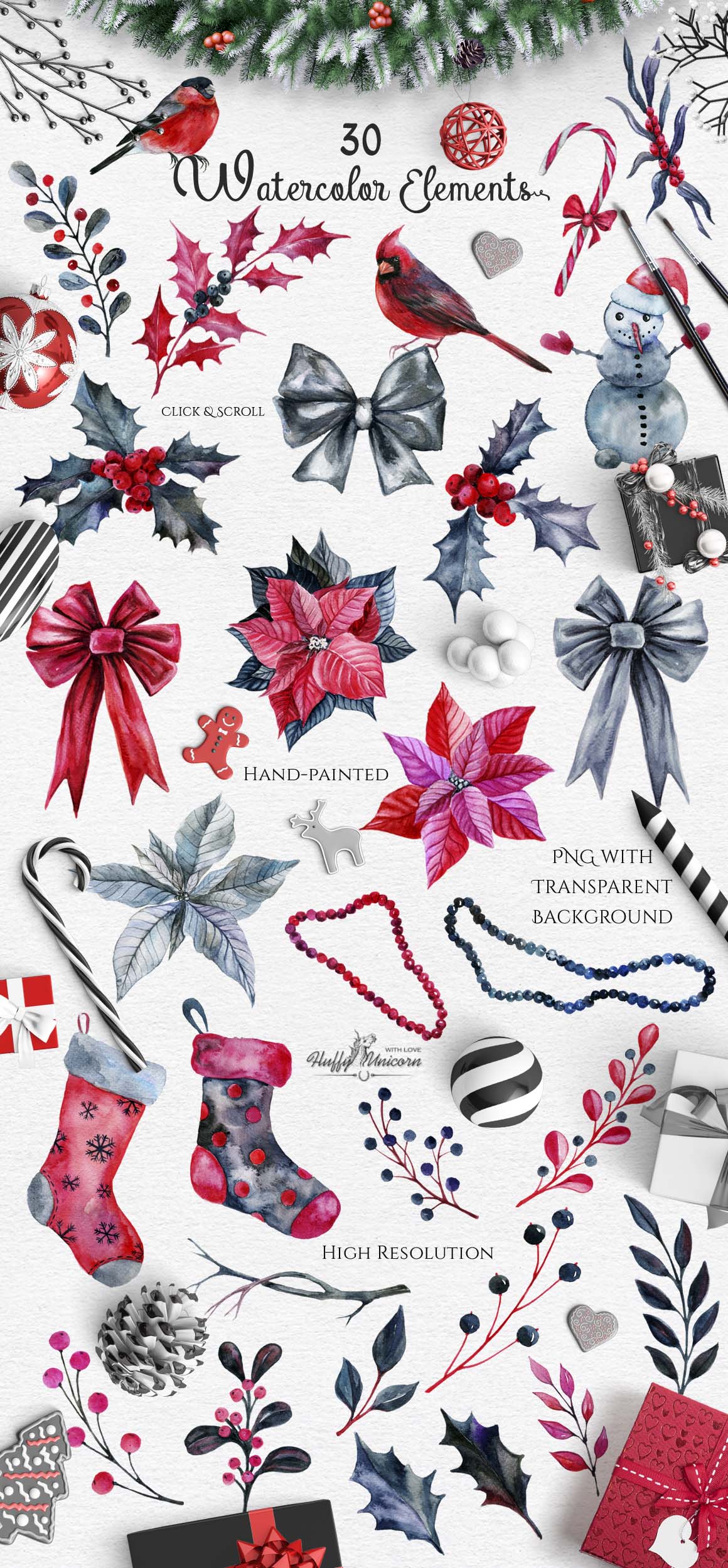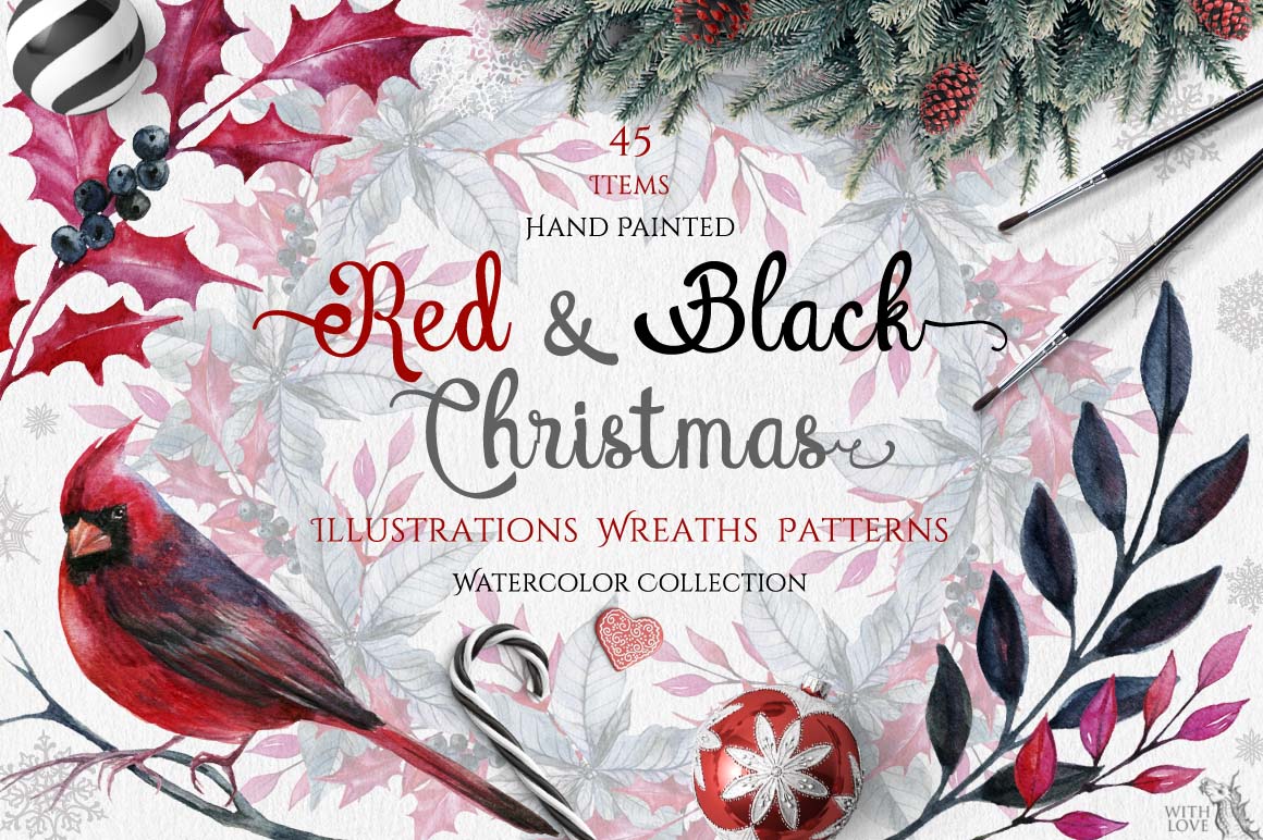 ‘m happy to present you my new hand-painted watercolor big set! 🙂 This collection, containing 45 graphic elements, include: birds, branches of holly, poinsettia flowers, bows, beads, Christmas accessories, seamless patterns and watercolor wreaths in a beautiful black-and-red colors.