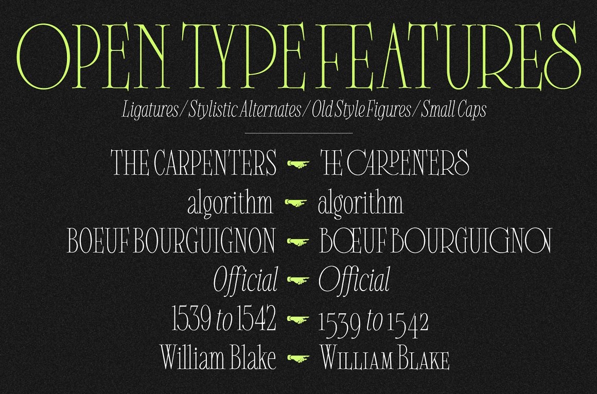 970 Glyphs total; True Italics; Open Type Features as stylistic alternates, ligatures, old style / tabular / fraction / superior figures, manicules and small caps; Multilingual (Include alternates)
