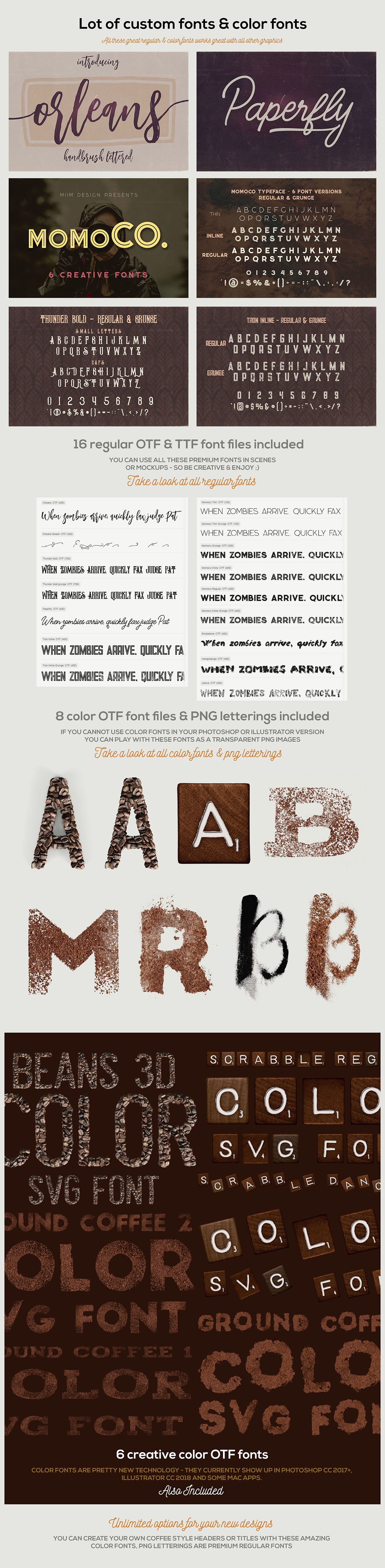 - 16 regular fonts + 6 color OTF fonts (working only in Photoshop CC 2017+, Illustrator CC 2018 and some Mac apps) + 8 transparent PNG lettering sets