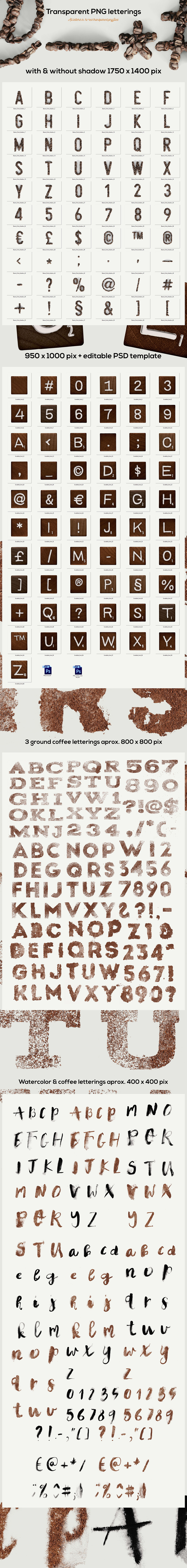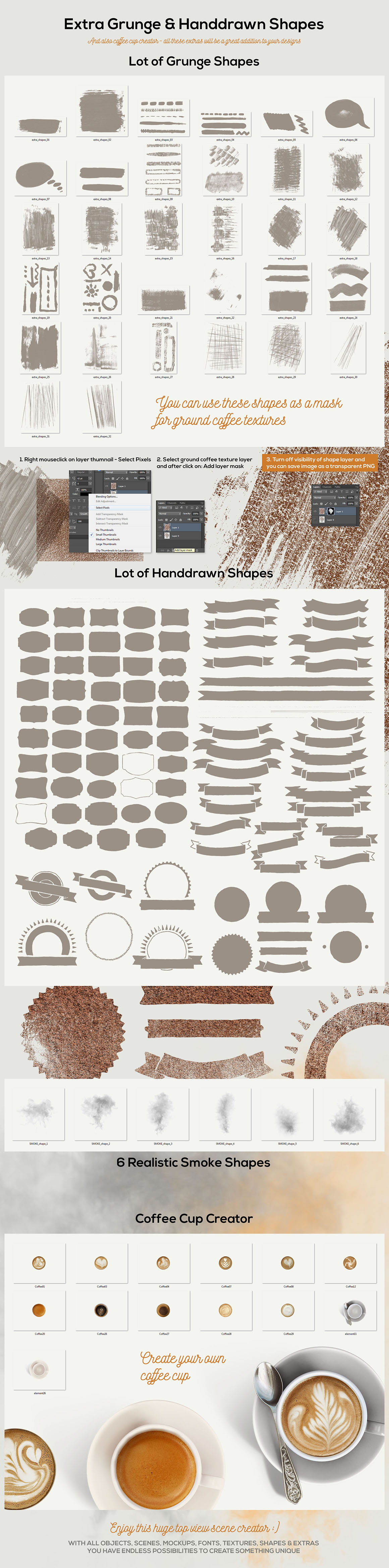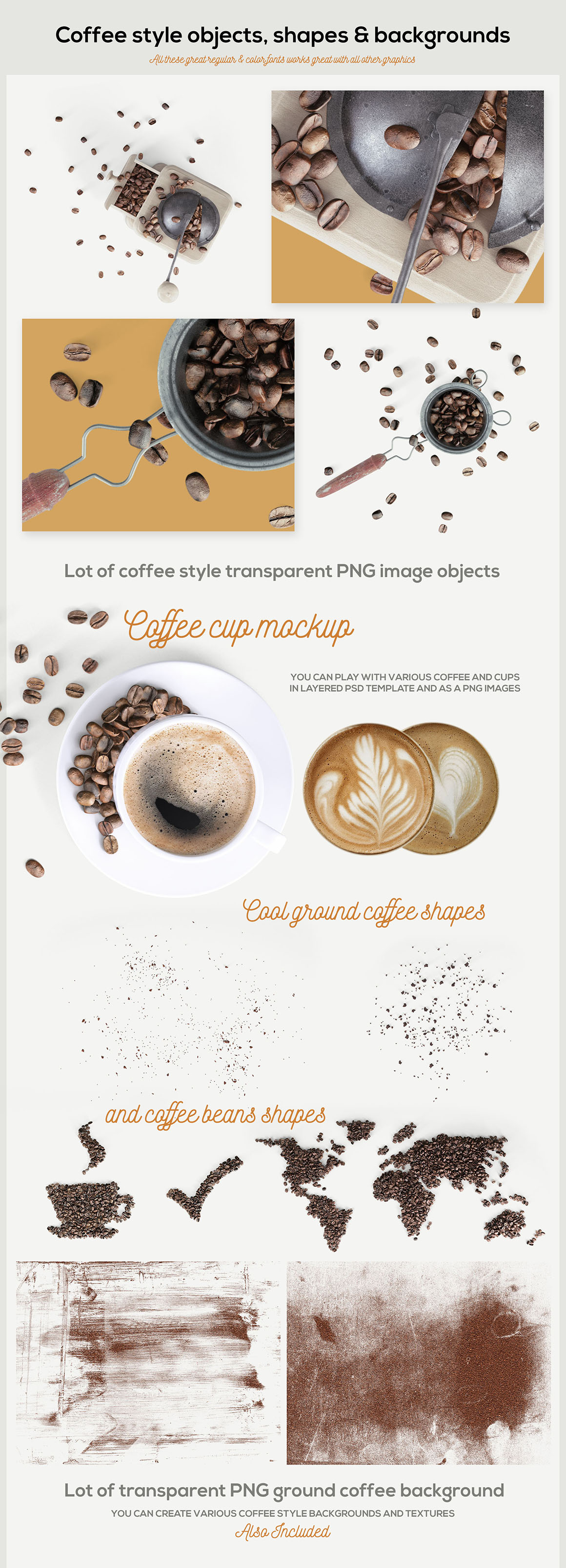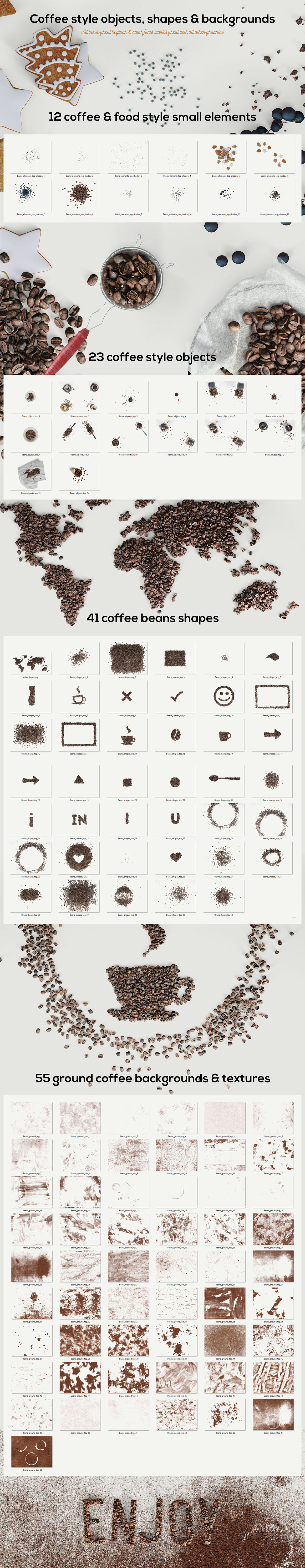 - Lot of coffee style objects, coffee beans shapes, ground coffee backgrounds