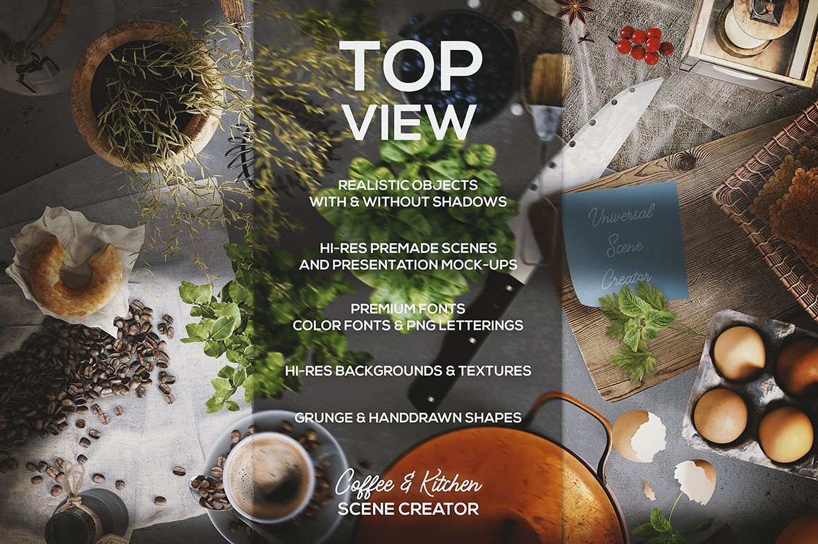 If you are looking for some professional 3D style scene generator for Adobe Photoshop with attractive TOP view then you are at the right place because here you will get amazing & HUGE bundle with 13 premade scenes, 19 mock-ps, 470+ unique objects, 280+ backgrounds & textures, 16 regular fonts & 6 color OTF fonts, 8 transparent PNG letterings and lot of extras. Great for your branding, headers, web projects, art projects, typography or any print projets!