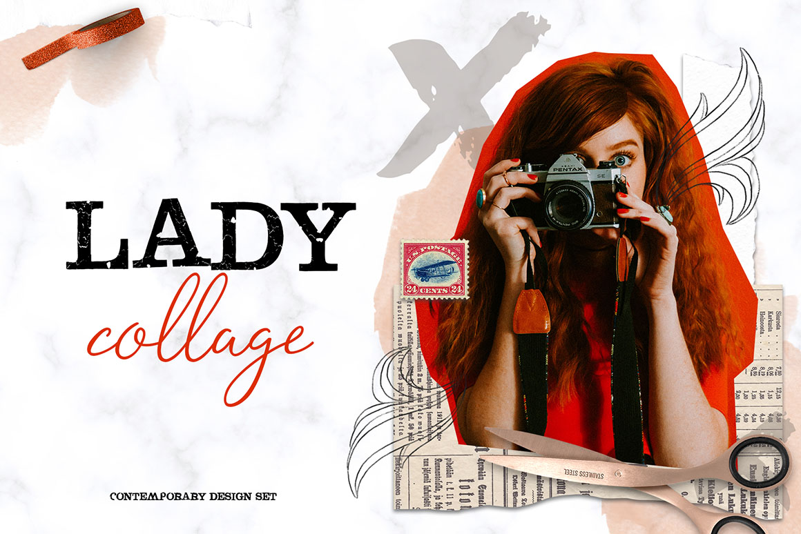 Stylish and cool Lady Collage help make your design very unusual! Textured papers, real stamps, ink doodles and elegant hand drawn graphics come together in this collage maker pack. Use the ready made elements or make your own using the shapes and vector files. Be sure to click on the image to see all elements.