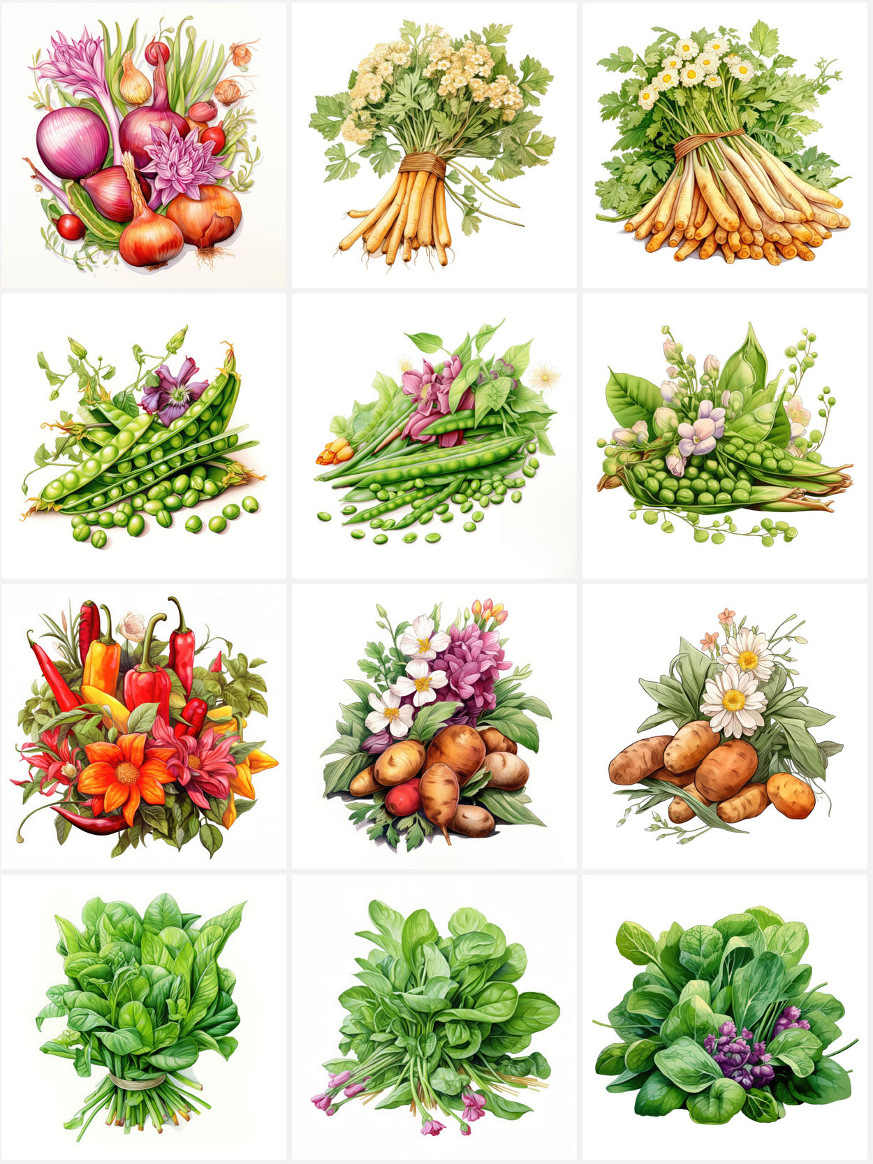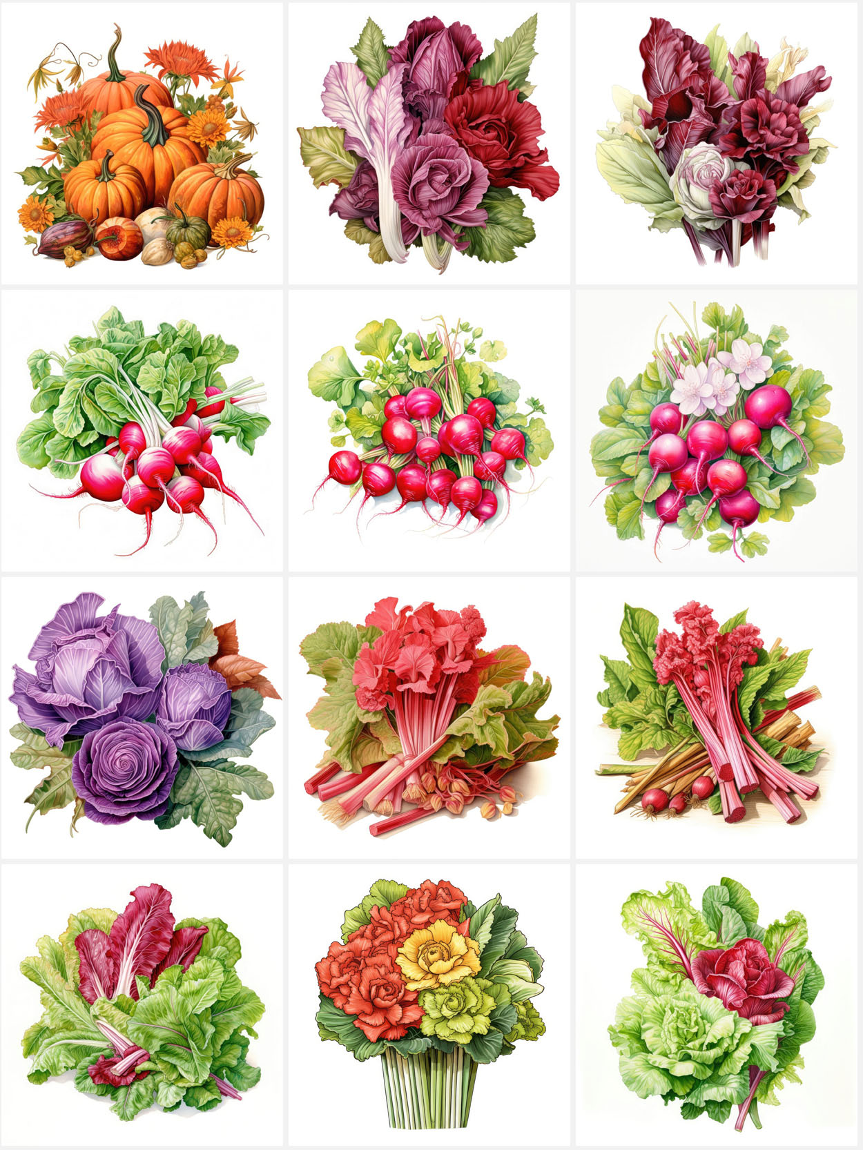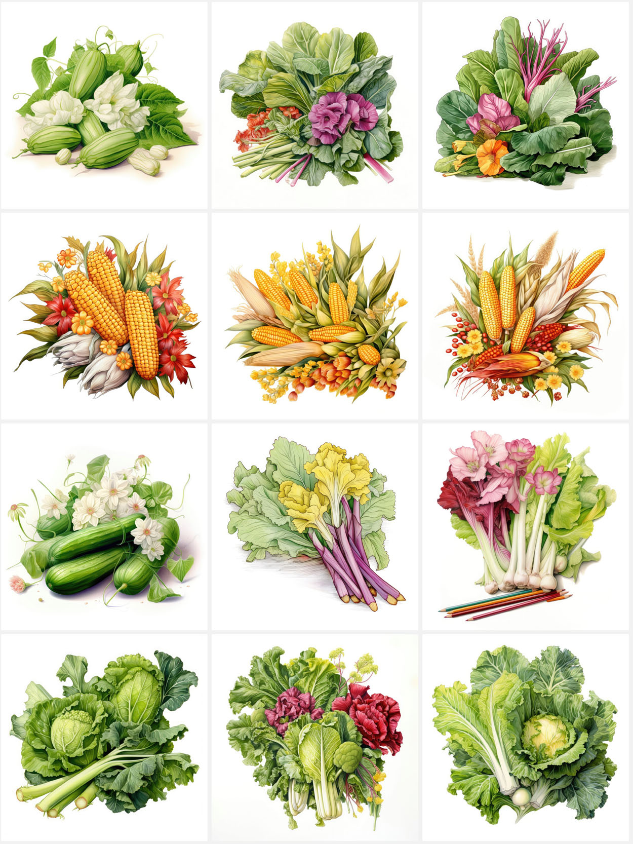 - 250 colorful vegetable sketches – Ai generated digital illustrations for your new poster, card, web or print designs!
