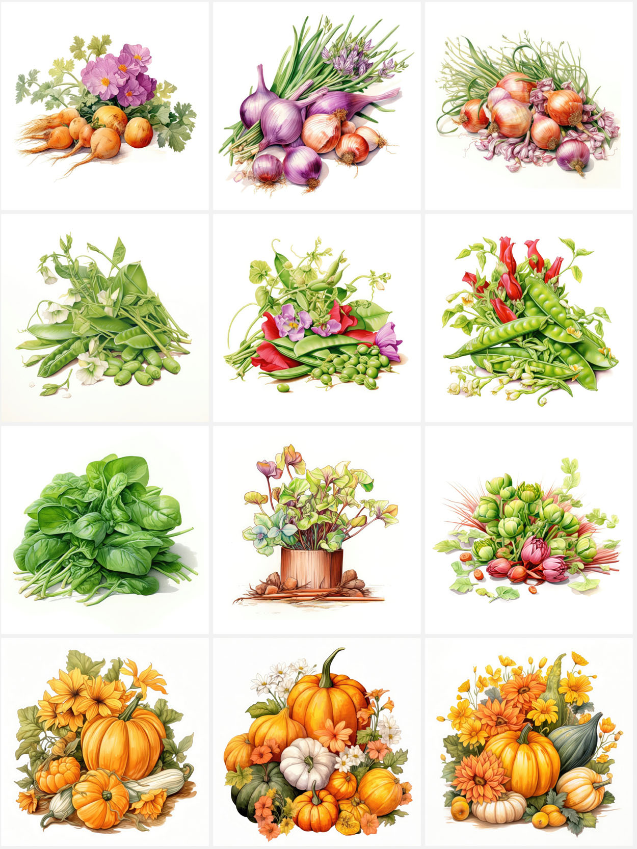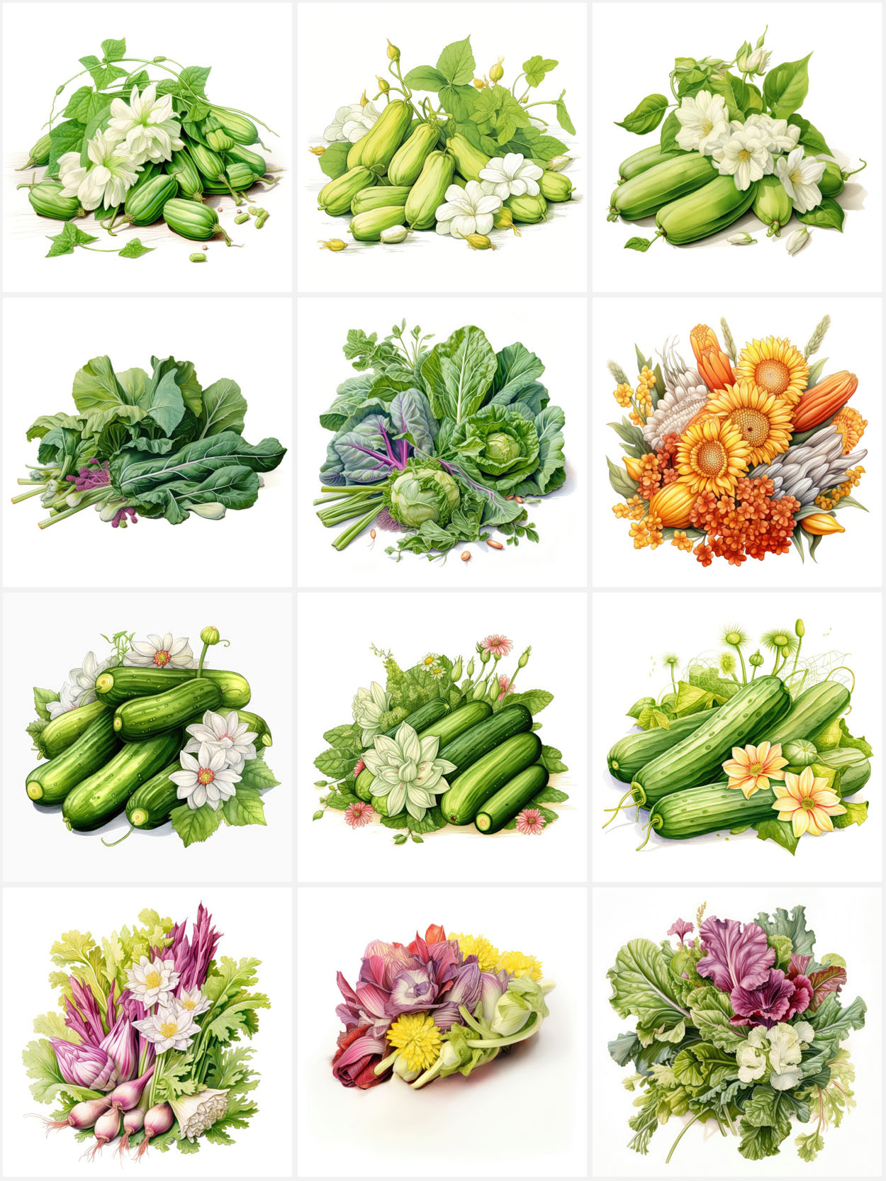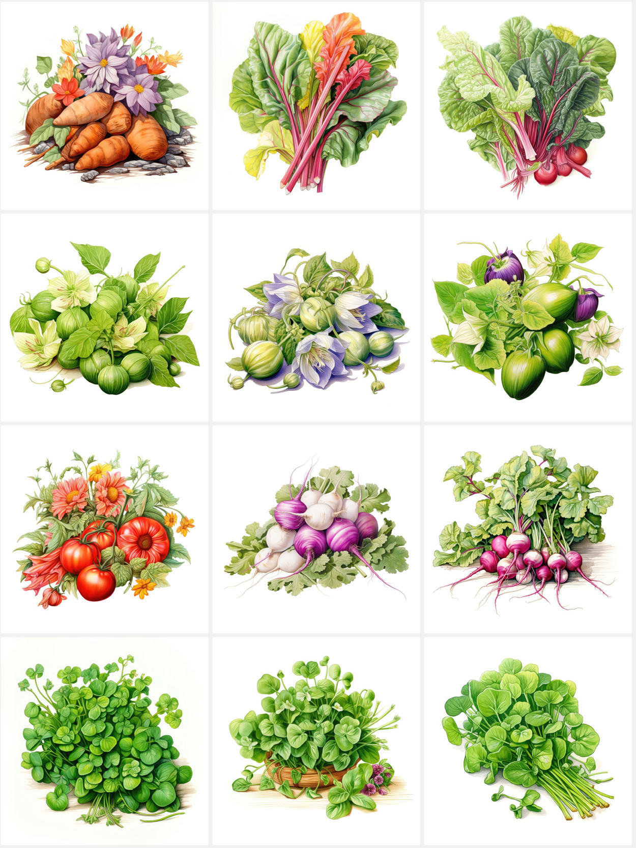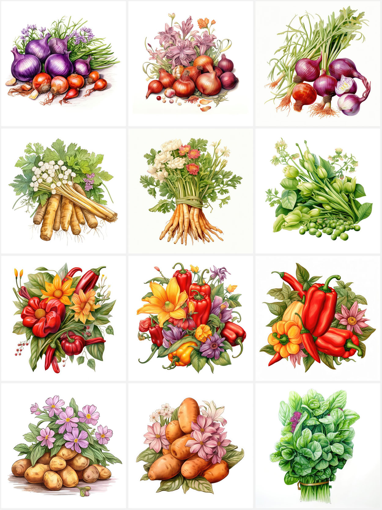 - 250 colorful vegetable sketches – Ai generated digital illustrations for your new poster, card, web or print designs!