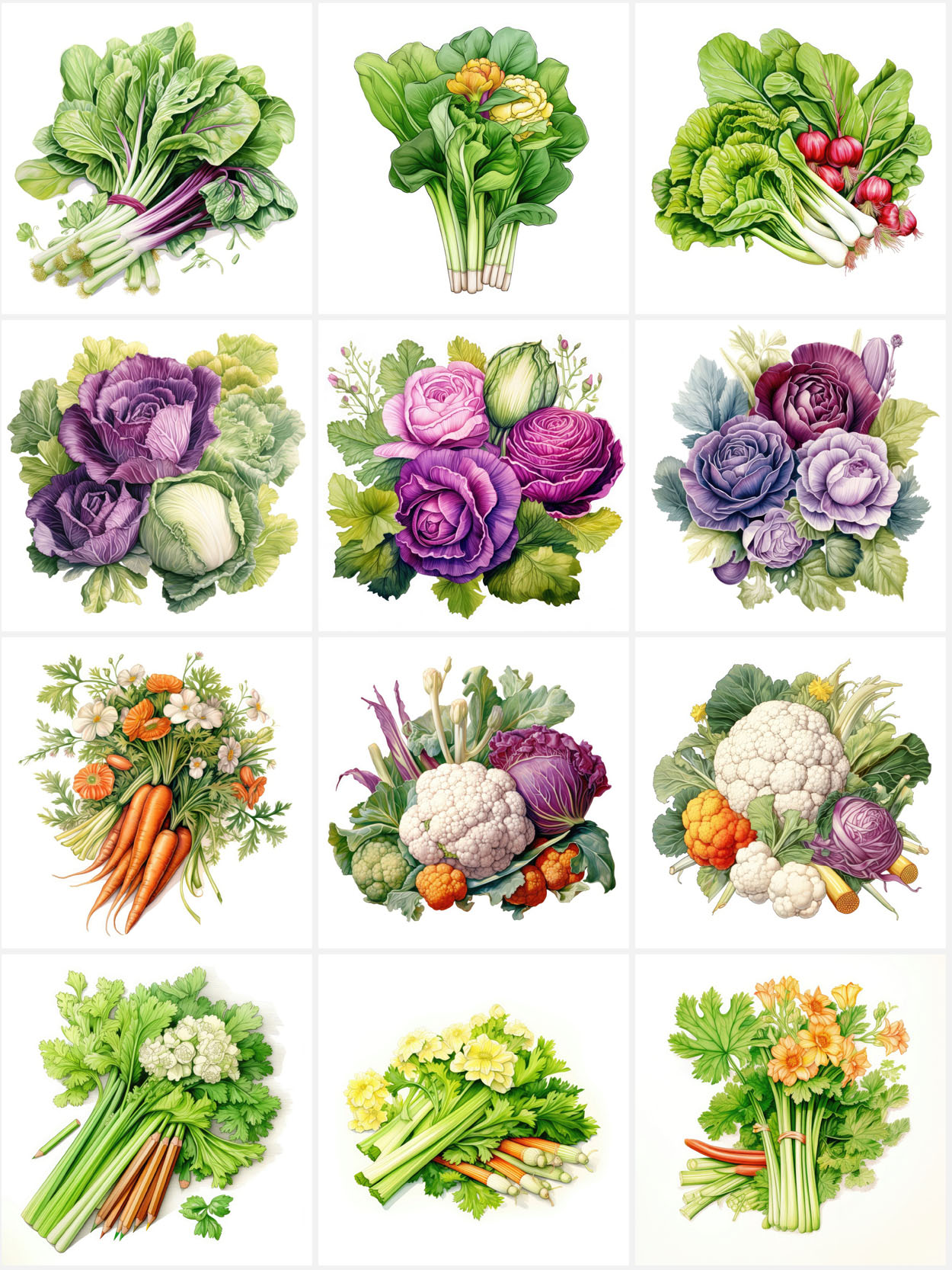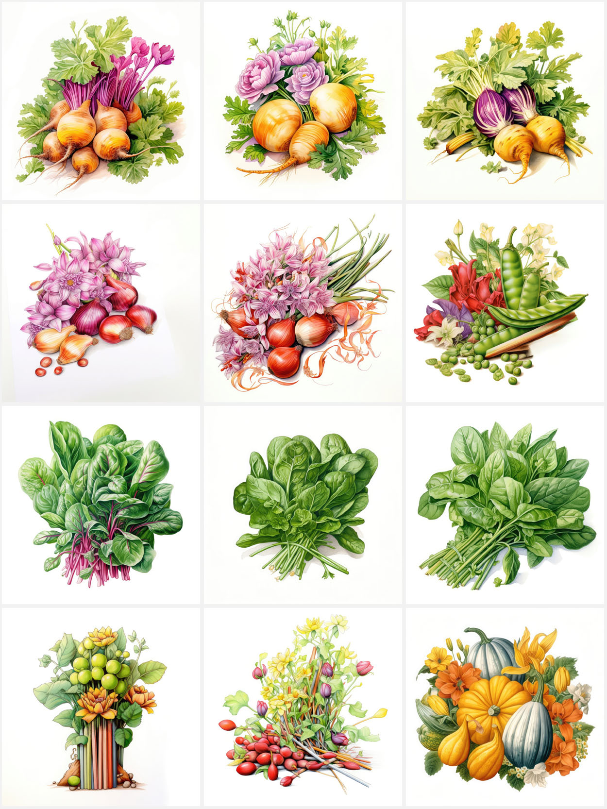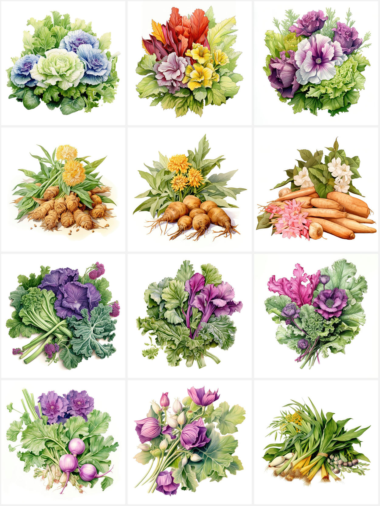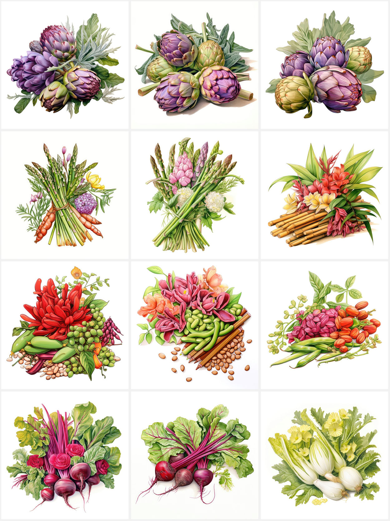 Discover our vibrant, high-quality collection of vegetable PNG images featuring piles of artichokes, bamboo shoots, Belgian endive, and cabbage, each complemented by their distinctive flowers and leaves. Our 250-image set is perfect for anyone looking to infuse their projects with a fresh, organic, and visually stunning touch. With each PNG available in 6144×6144 pixels, your images will be clear and detailed. Whether you’re a designer, teacher, food blogger, or marketing professional, these images will serve a multitude of purposes. Plus, with a commercial license included, the possibilities are truly endless!