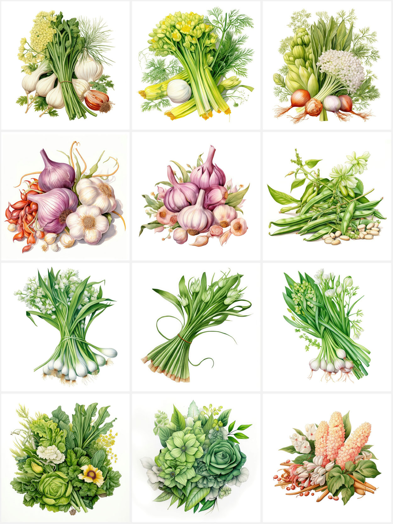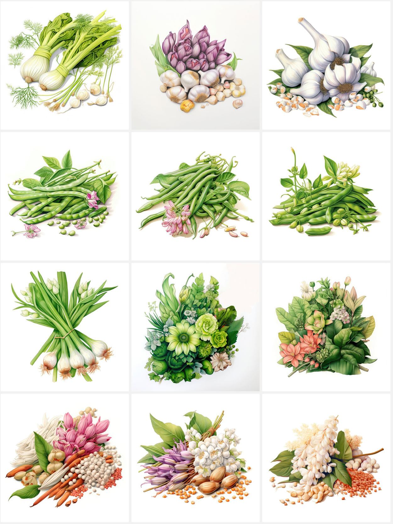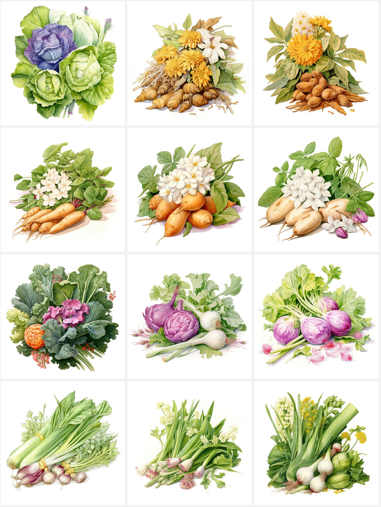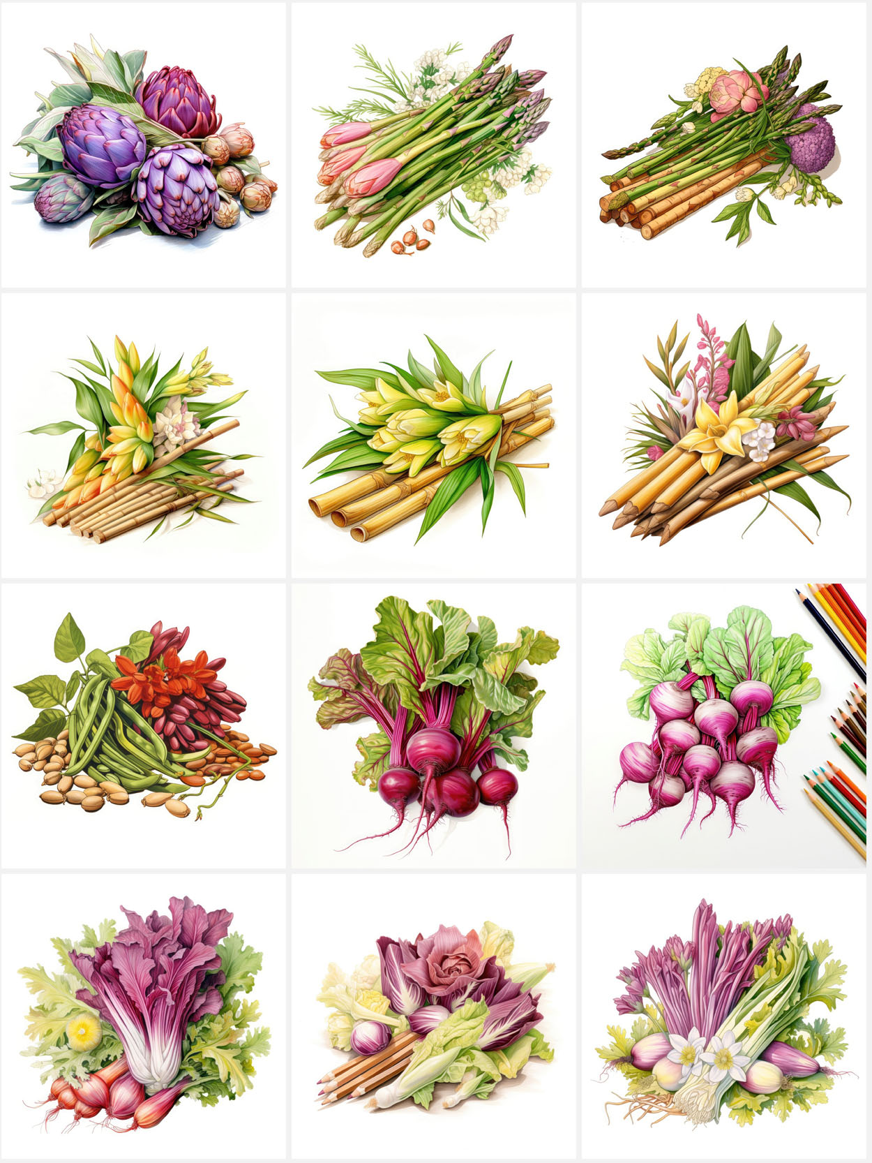 Discover our vibrant, high-quality collection of vegetable PNG images featuring piles of artichokes, bamboo shoots, Belgian endive, and cabbage, each complemented by their distinctive flowers and leaves. Our 250-image set is perfect for anyone looking to infuse their projects with a fresh, organic, and visually stunning touch. With each PNG available in 6144×6144 pixels, your images will be clear and detailed. Whether you’re a designer, teacher, food blogger, or marketing professional, these images will serve a multitude of purposes. Plus, with a commercial license included, the possibilities are truly endless!
