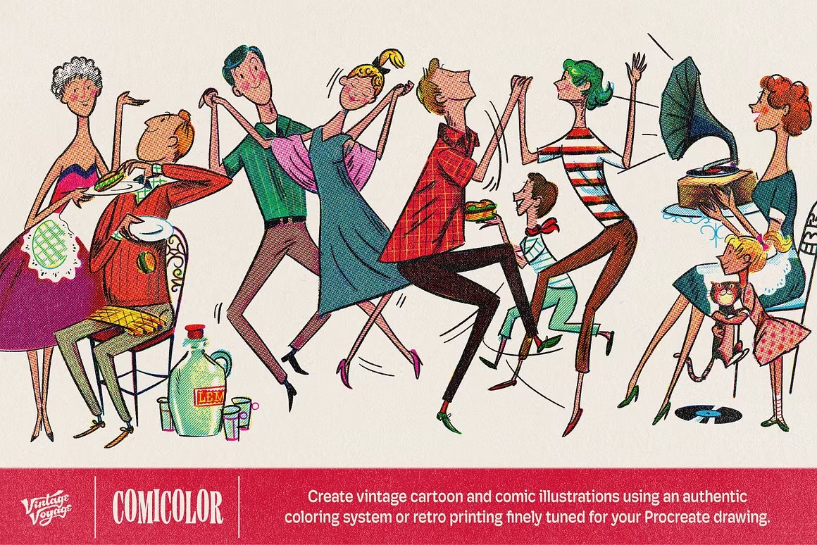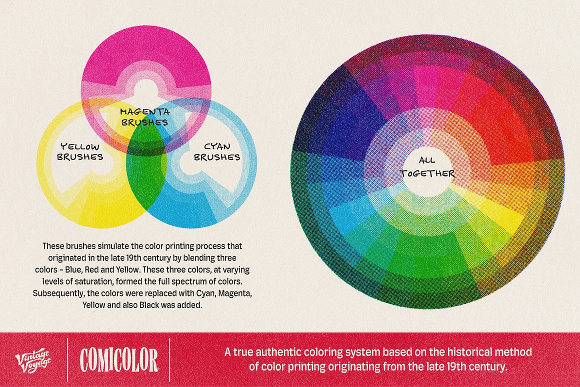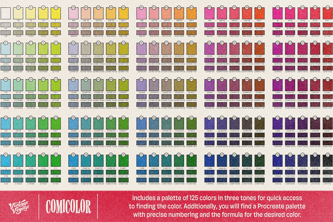 With ComiColor you can turn your illustration into a true retro comic, manga, or any other artwork that will look like it was printed in the mid-20th century! This unique product stands out for reproducing a real printing system that uses only four colours. This system was developed in the late 19th century and found widespread use during the heyday of advertising, design, and comics starting from the 1940s. The brushes are crafted with attention to detail – each pattern of each of the four colours is tuned at a specific angle, allowing you to achieve the desired color result. To assist you in color selection, you’ll receive a PDF Color Palette with the specified color formulas, as well as the same color palette for Procreate. With it, you can easily and quickly access the color and its formula.