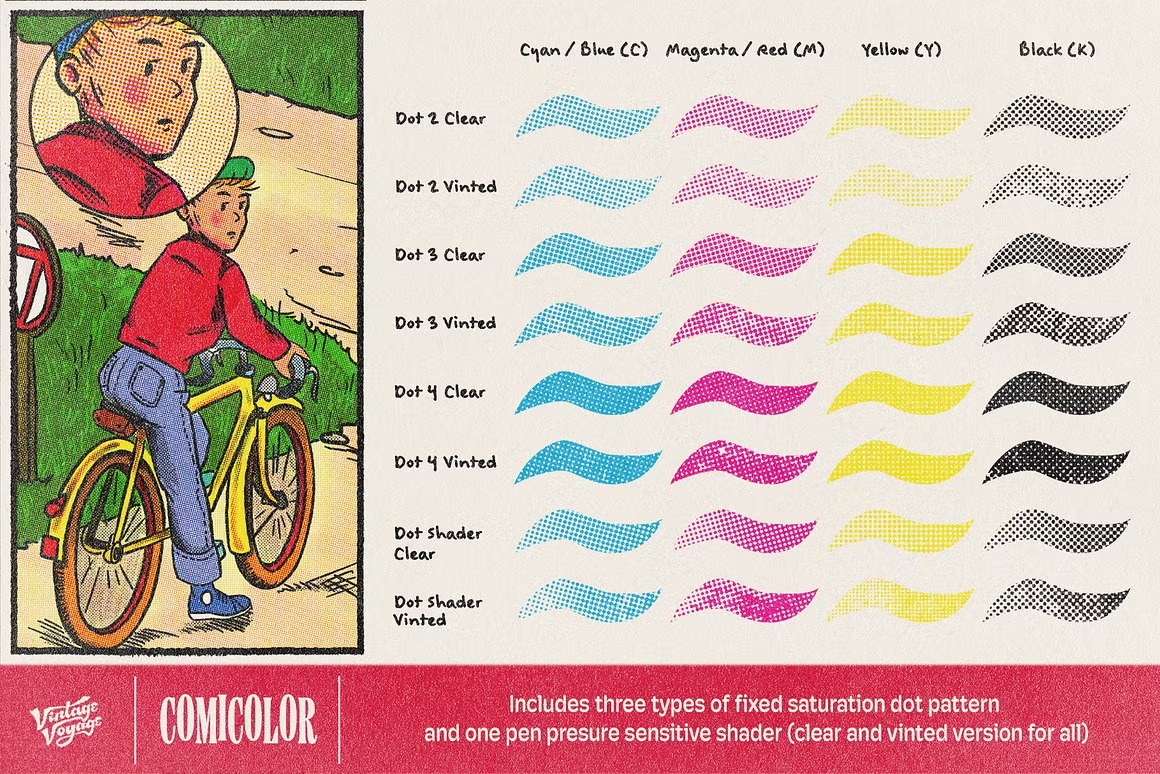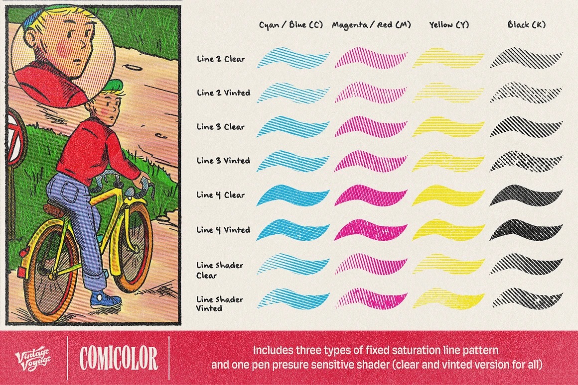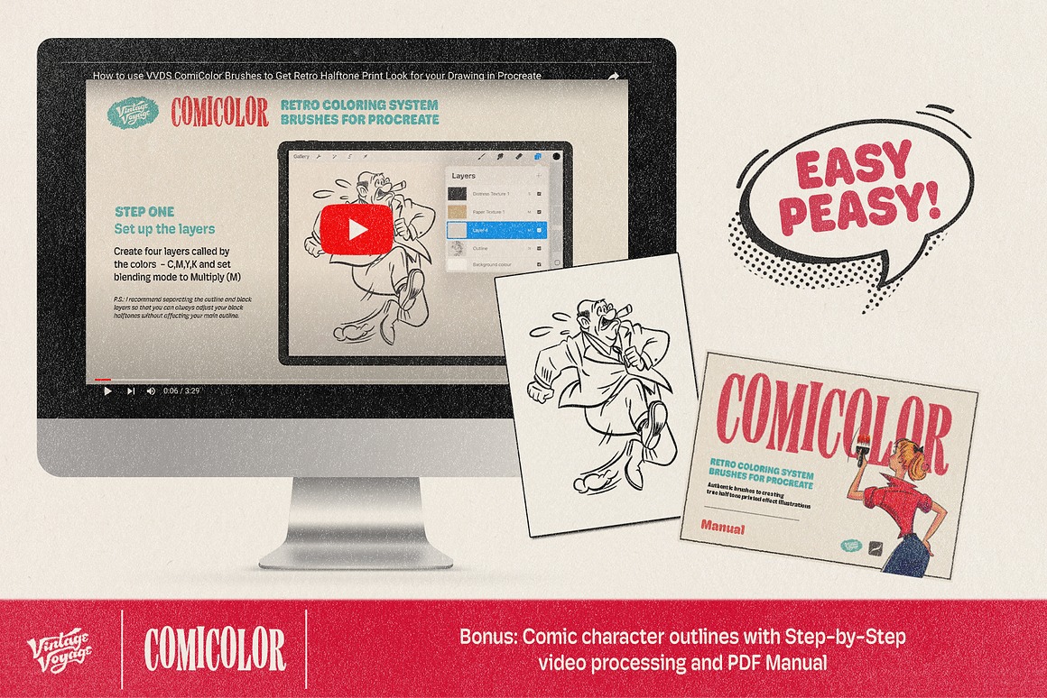 You can choose whether to use Dots or Lines, or both. Additionally, you can decide whether to use clean halftones (for example, if you want to create illustrations for printing on screens) or textured ones to impress your Instagram followers. The set also includes ink brushes for drawing excellent outlines that will truly give your illustration an analog look and 16 Vintage Paper textures that will transform your illustration into a genuine scan of a vintage picture. Moreover, included in the set, you’ll find a ready-made outline drawing and a video tutorial on how to color it using the ComiColor brushes. This way, you’ll quickly feel more confident with this product.