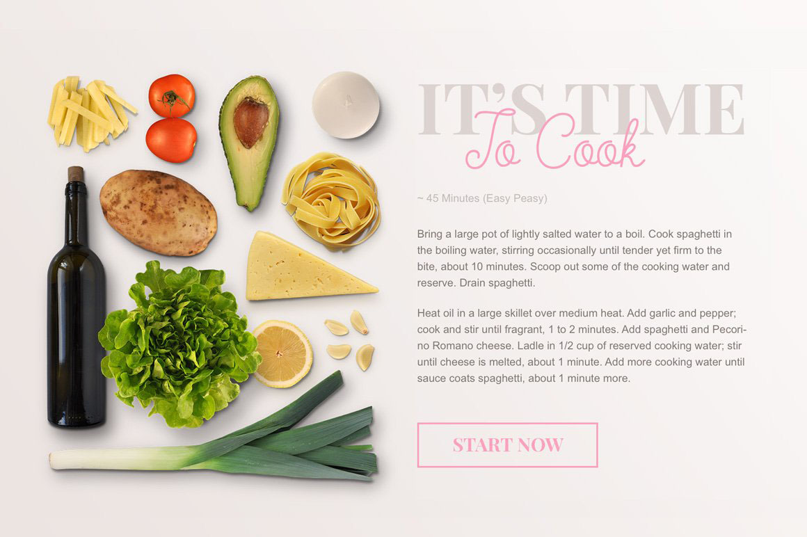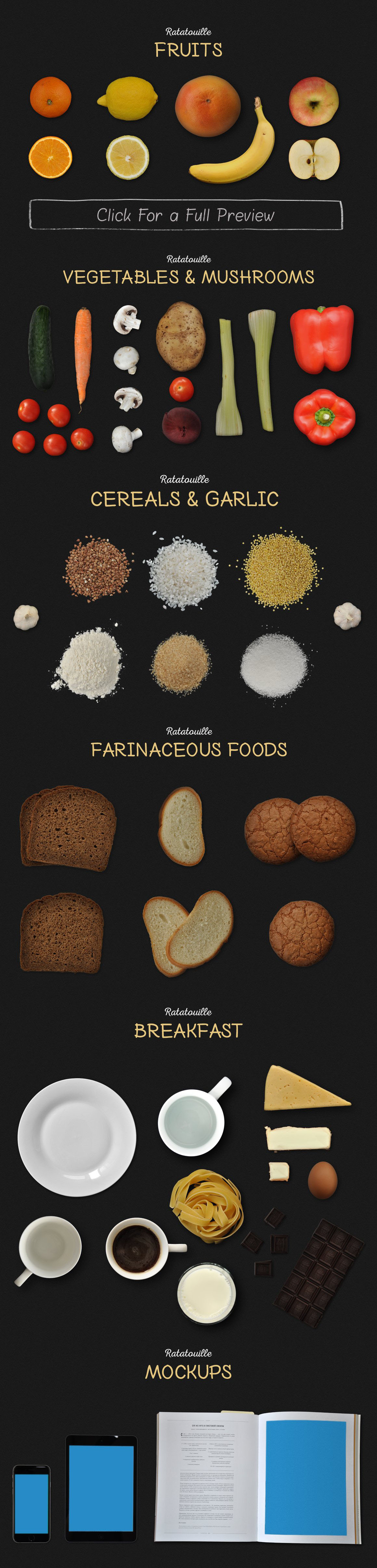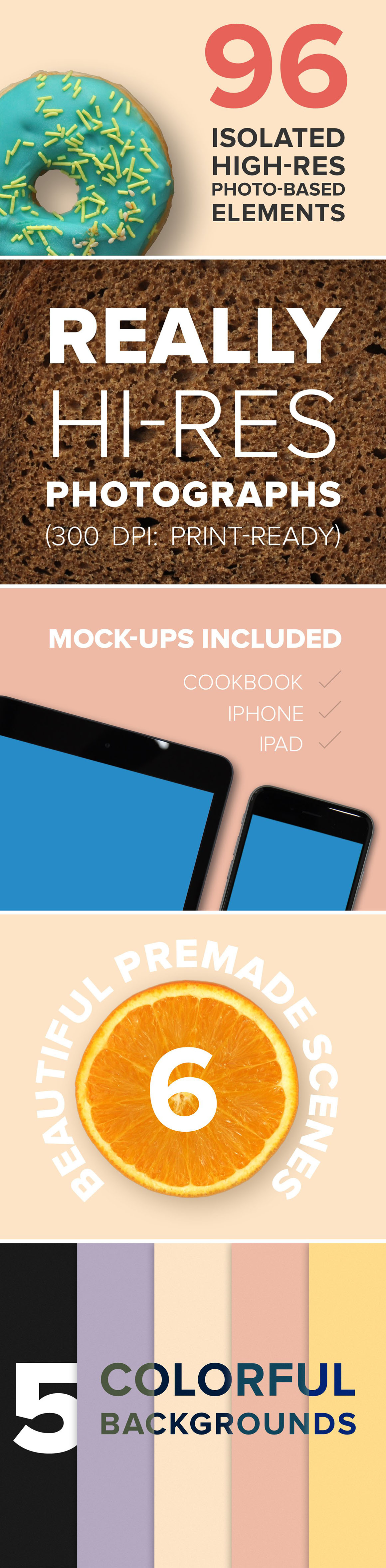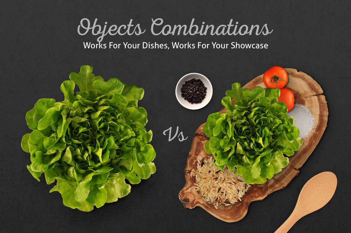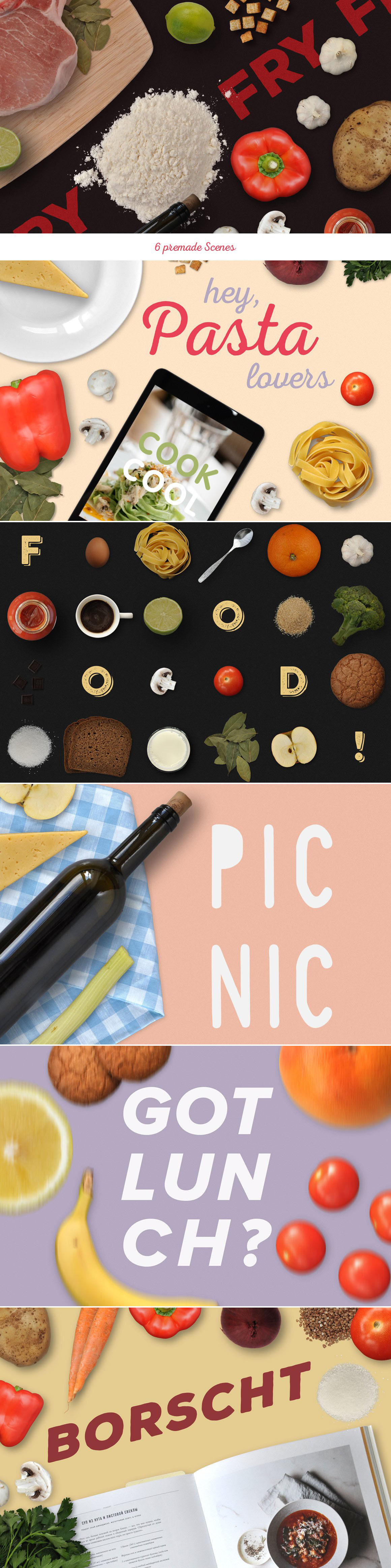 I’m happy to introduce you my scene generator, Ratatouille! It’s based on professional photos in high resolution. All you need to do is to open the PSD file, pick the items you need and compose your original custom scene. Objects and shadows fully separated so you can easily play with them. It can be used for Retina big screens and print projects. There are three Mock-ups – iPhone, iPad and Cookbook. Double click on a smart object, paste your text (or logo, or design) and text will change on the item. Use it for Websites, Banners, Hero Images, Header Images, Presentations, etc. There is no limitation where and how you can use it. Furthermore, you get five colorful background and 6 pre-made and ready to use scenes.
