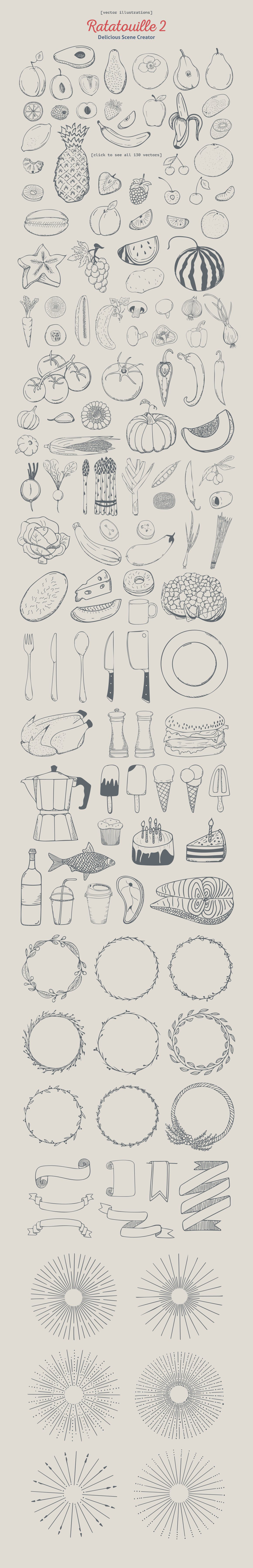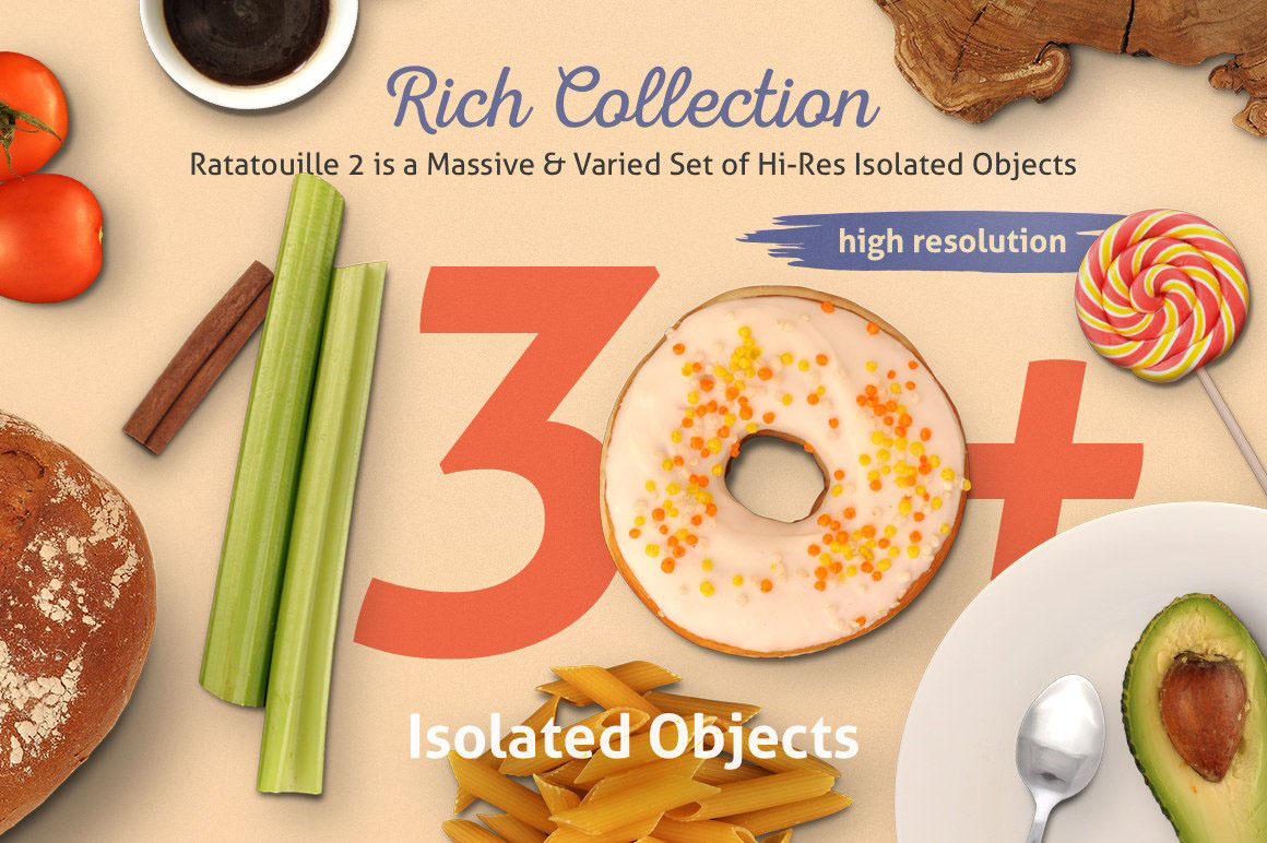 I’m happy to bring you the sequel to my most popular premium product of all times, Ratatouille Delicious Scene Creator! Meet the all-new, twice bigger, fantastically enhanced and expanded, Ratatouille 2. Check a collection of the based on the real high-resolution photographs objects, offering a new level of quality and variety! The massive hand-drawn vector set of over 130 illustrations included in the package will fulfill you with even greater artistic freedom. And a set of 8 pre-made scenes will serve as a delicacy for your imagination.