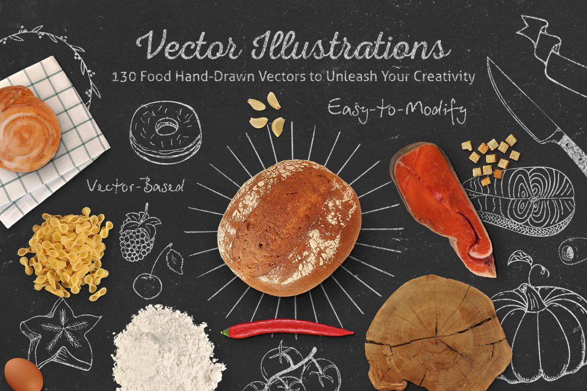 - 130 Hand-Drawn Food Vector Illsutrations in EPS, AI, and SVG format;