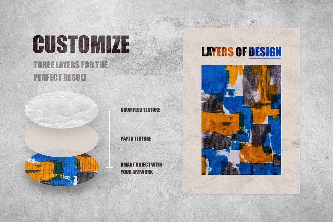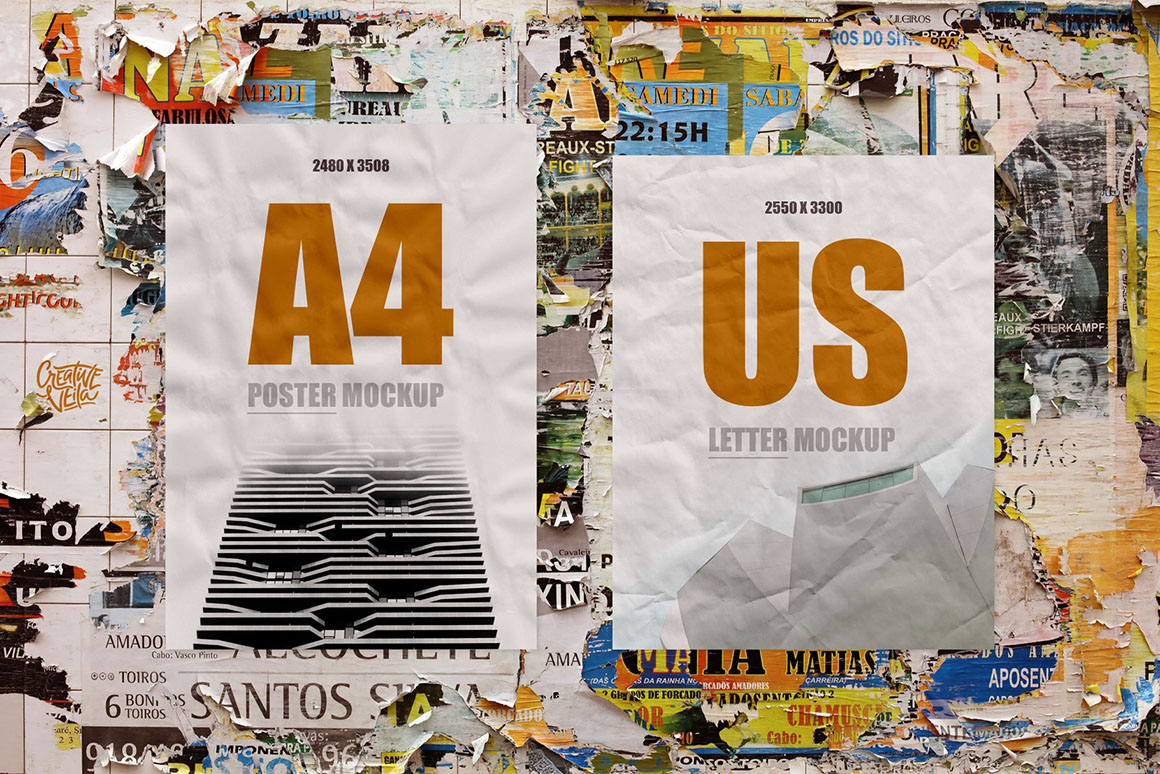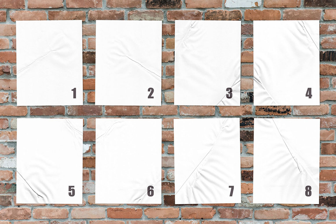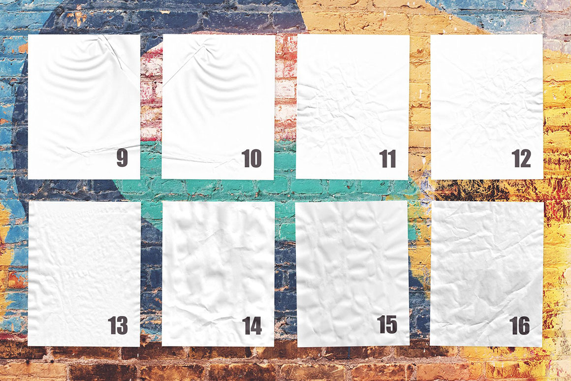 Unless you have time to take a walk to the scenic neighbourhood, grab a coffee, and take a few promo shots of the fresh printed work of yours, these PSD poster mockups would be the best option to showcase your graphic design project. Just imagine you can get a radiant photo of your poster, ad, or any other design printed and glued in the most graphic areas of your city! Well, my new mockup set brings you the next great thing — customizable scene creator where you can switch between two poster formats, 16 crumpled paper textures, 3 seamless paper styles, and 13 wall backgrounds in a few clicks! Just place your artwork inside the Smart Object and pick the best combination of the overlays you can.