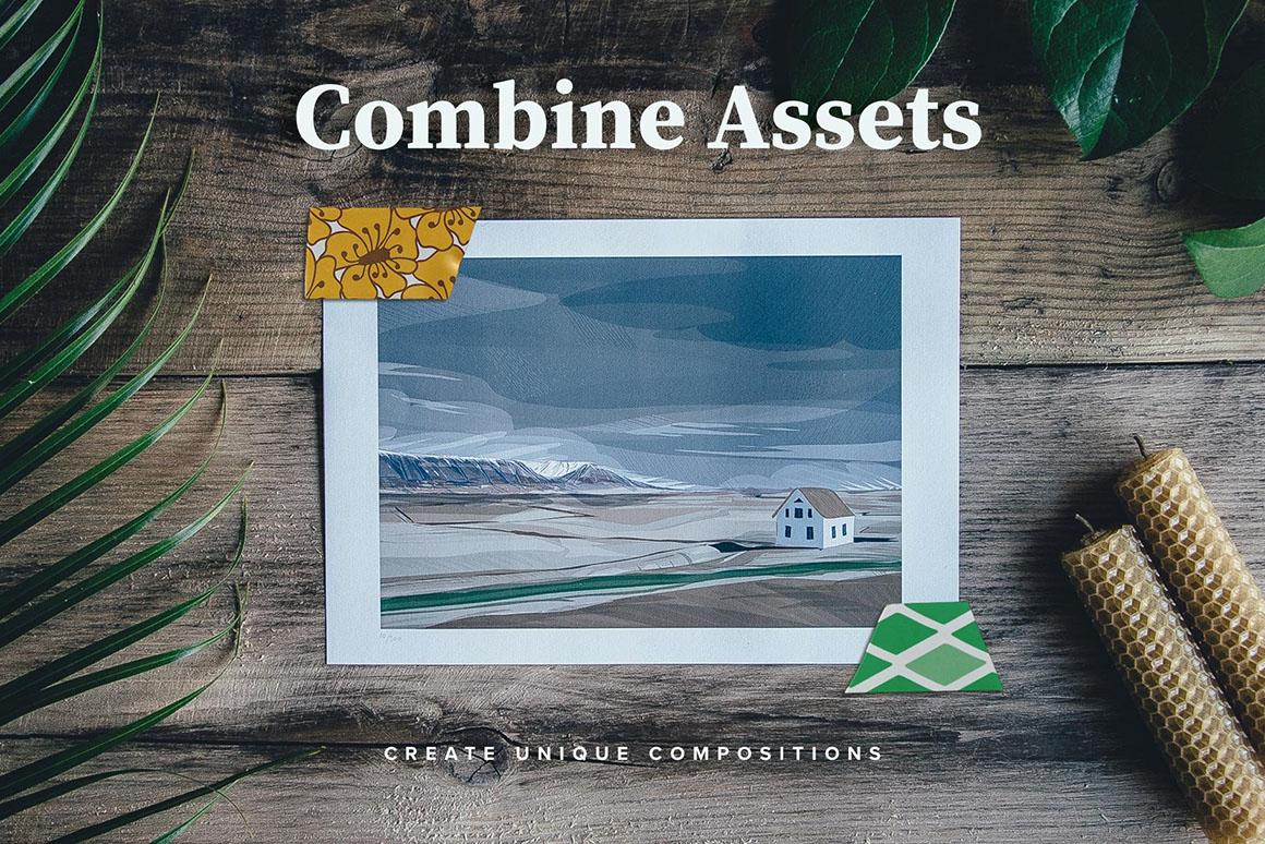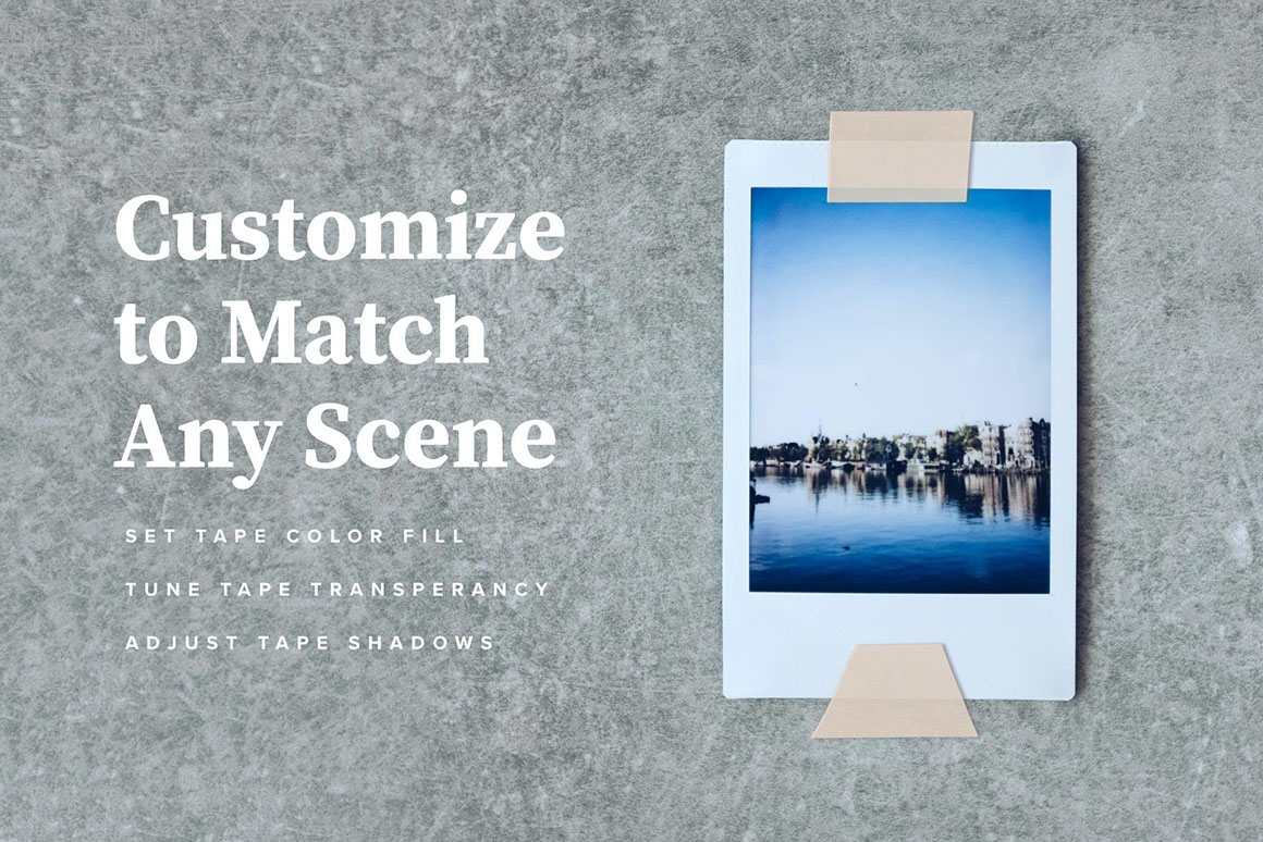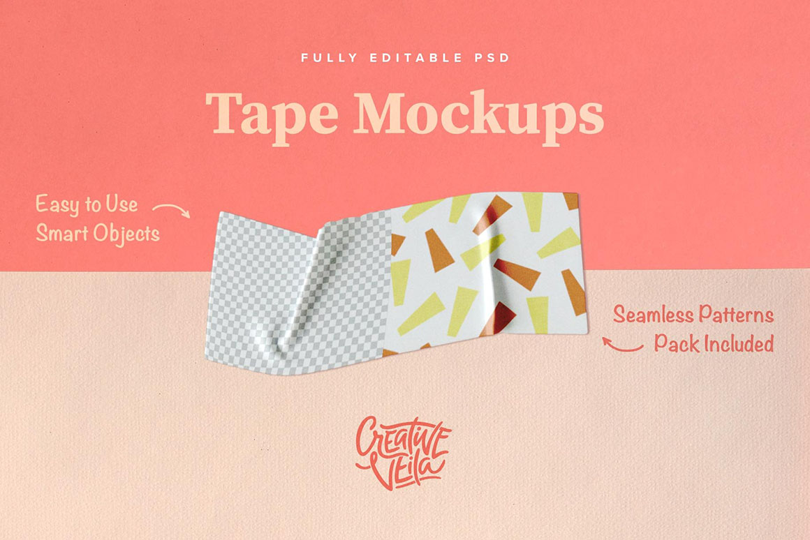 Coming originally from traditional Japanese paper, Washi tape is the most vibrant element you can add to your mood-boards, scrapbooks, or packaging. It’s all the same for digital art. Get my new mockup set featuring nine fully customizable tape templates to add this perfect finishing touch to your graphic design projects! Adjust tape design (or set a solid color fill), transparency level, and shadow settings to match any scene you need. To give you even more options I’m happy to include a set of 20 high-resolution geometric and floral patterns for Photoshop! Just open the smart object with tape design, and apply pattern layer style for the best result. Just as easy as it sounds.