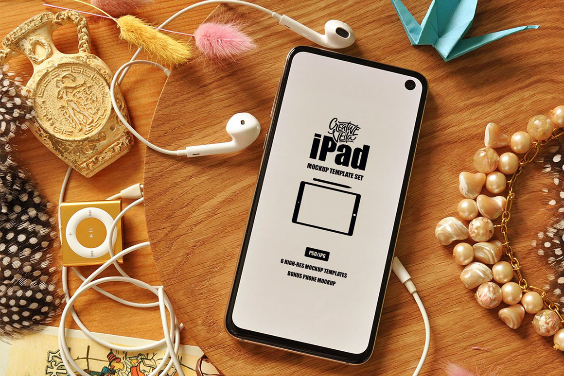 iPad mockup templates can be very advantageous to present almost everything — from a new blog post to a graphic design project you’re working on. Especially if you’re a fan of Procreate resources like I am. That’s why this pack includes six diverse mockup scenes with the iPad Pro and its editable screen in the center! Just edit the Smart Object by replacing the placeholder image with your design, and it’s right there within seconds — on the kitchen table, among traveler’s belongings, and in the middle of the Halloween party. The package brings six high-res (3000×2000) PSD templates, well-organized and ready to customize. As a bonus, I’ve also included a scene with an Android smartphone. Just in case you’re about to showcase something mobile-related ?
