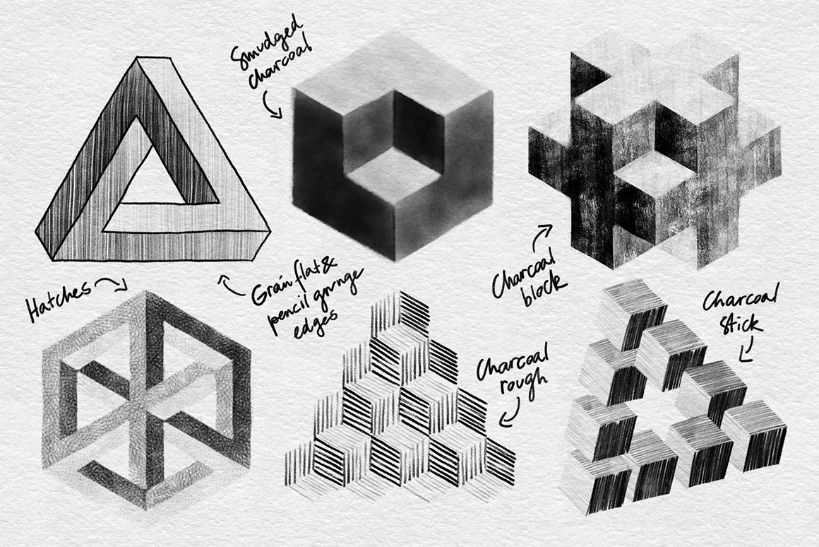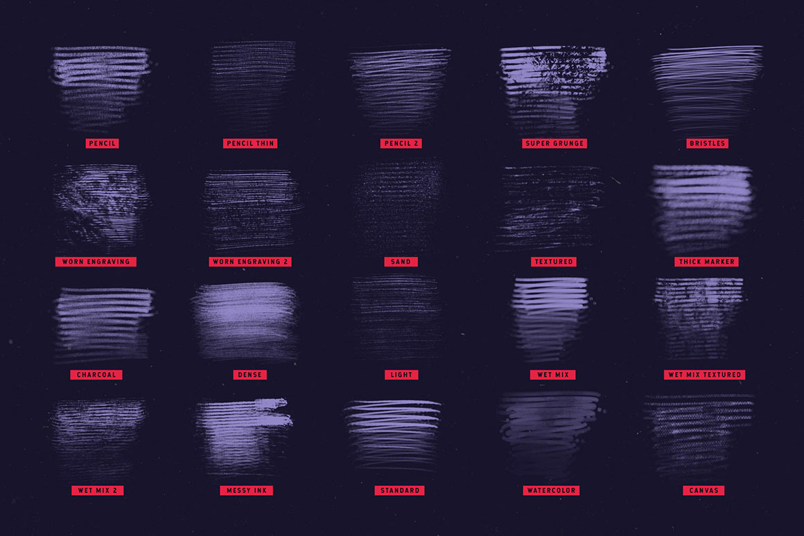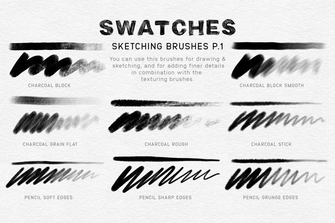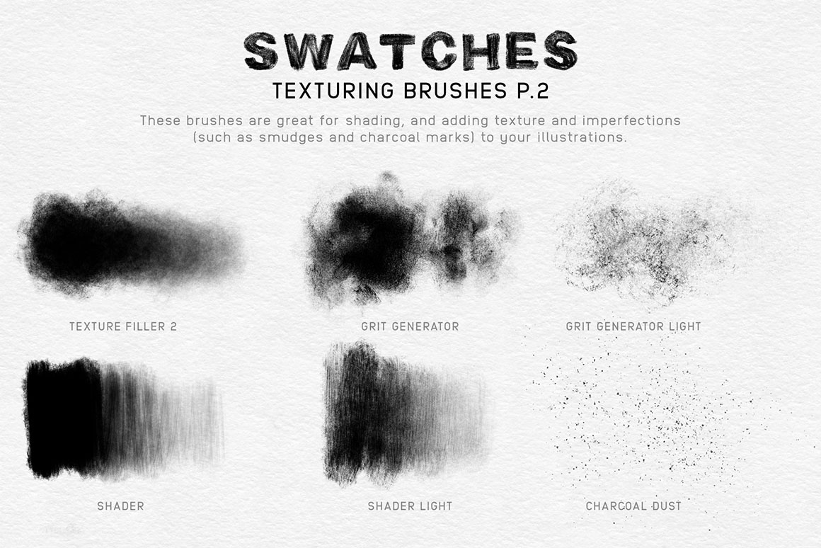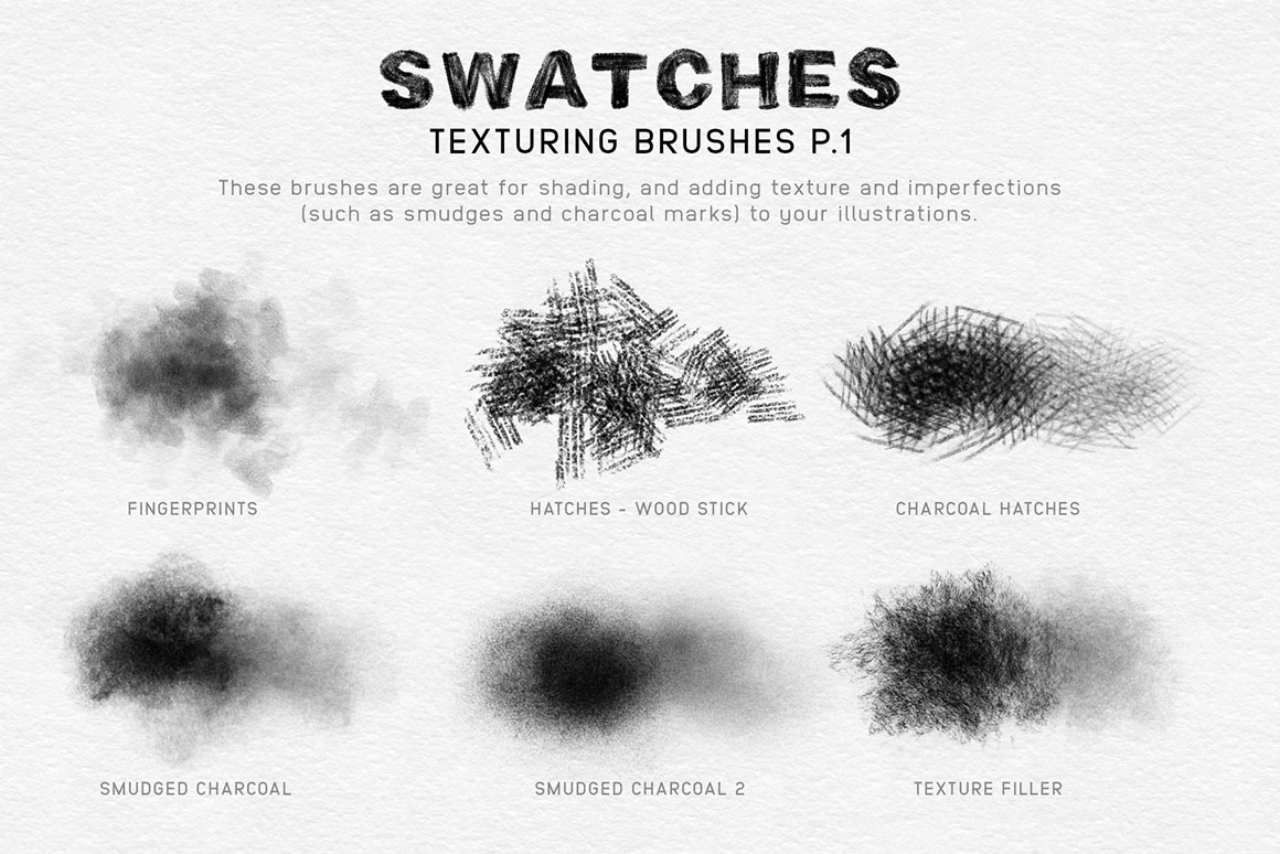 Texturing brushes: These brushes have kept some of the texture of the original samples they were created with, so they’ll allow you to add realistic charcoal elements to your designs, such as smudges, dust and fingerprints.