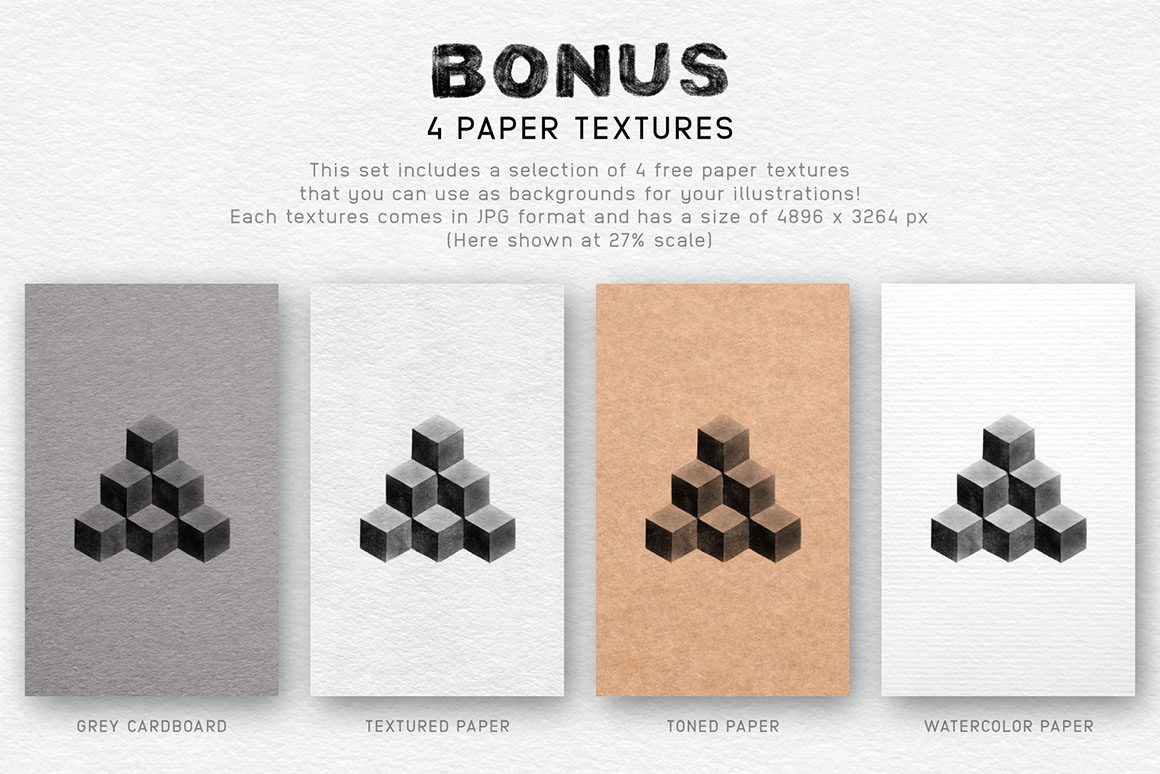 Bonus paper textures: I’ve also included 4 free textures in this set – import them to your Procreate canvas, and place them at the bottom of the layers stack to get a textured paper background!