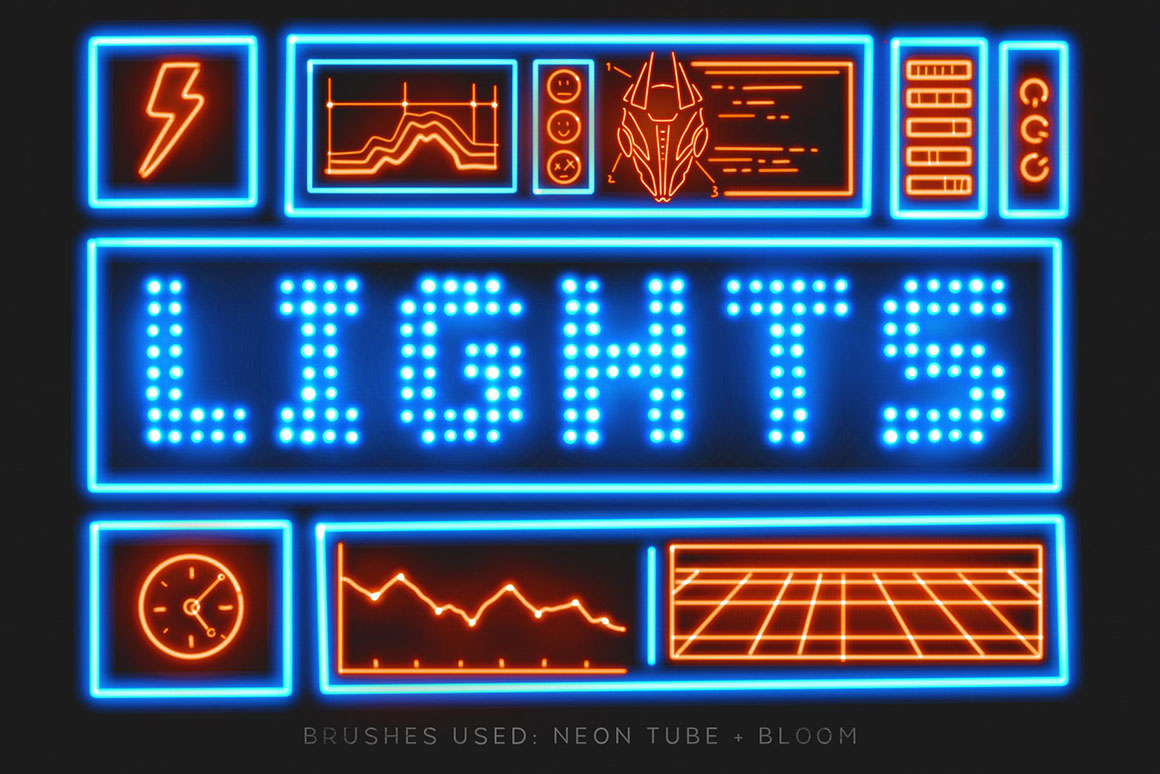 Create your own digital light paintings with these Procreate brushes! Whether you want to draw neon signs, create glowing lettering, or add special effects such as flames or bloom to your illustrations, this set includes a nice variety, with a total of 27 brushes to choose from. The light effect is “built in”, which means you just have to select a bright color, and start painting 🙂 The pack is composed of 3 categories: Light pens (for lettering or painting), Flames, and Effects.