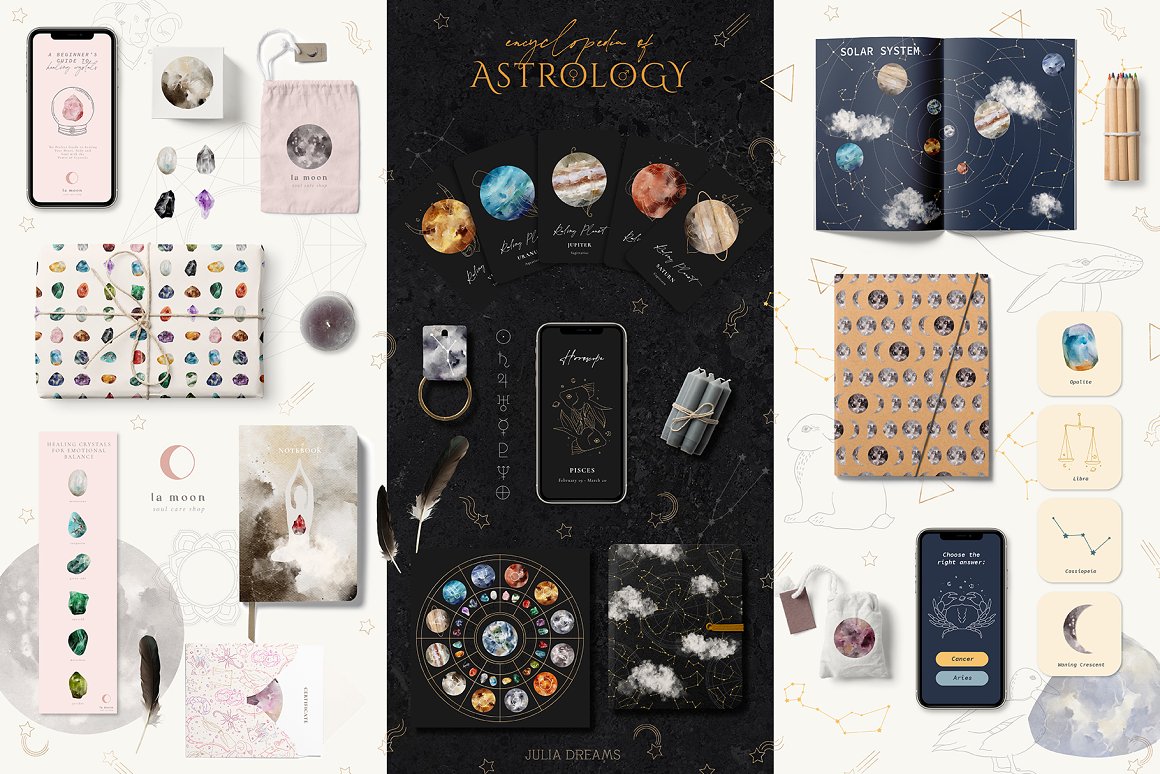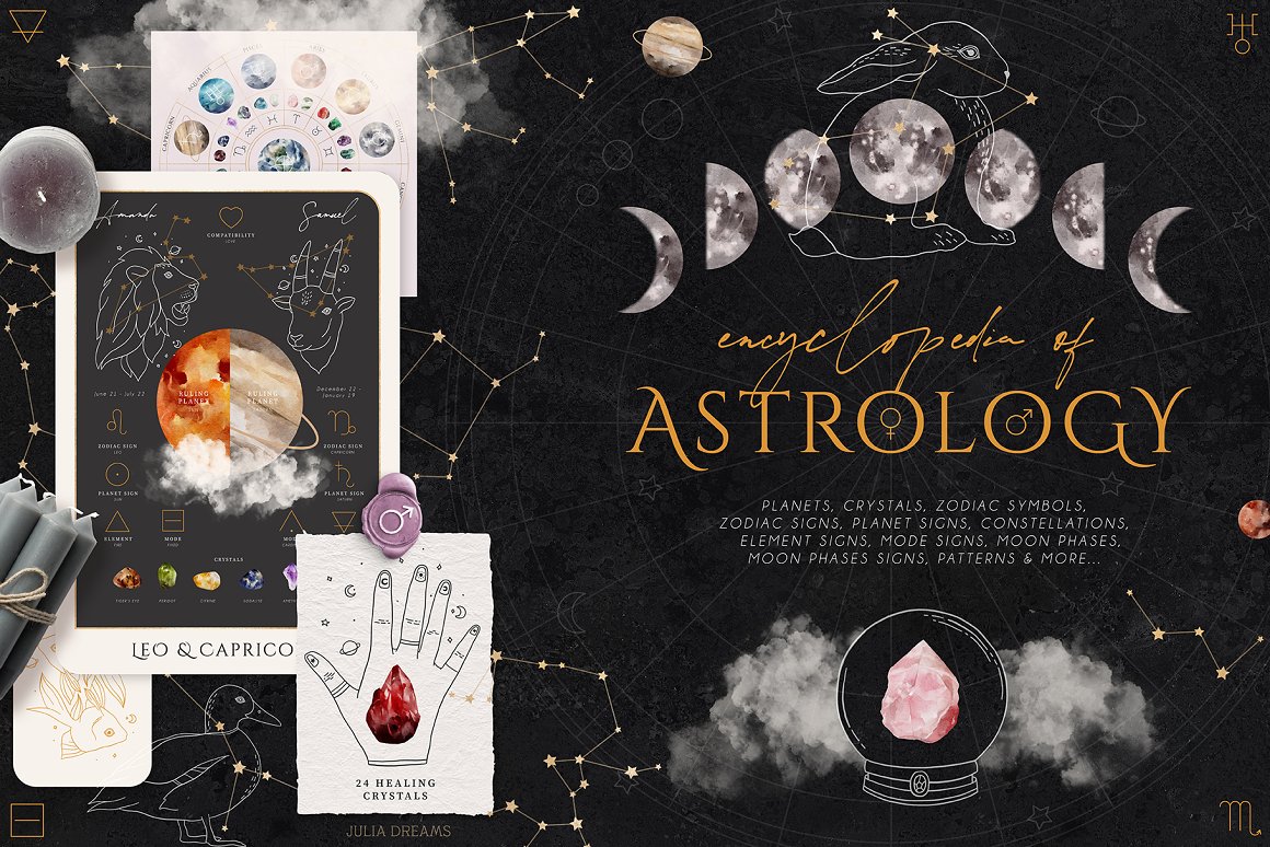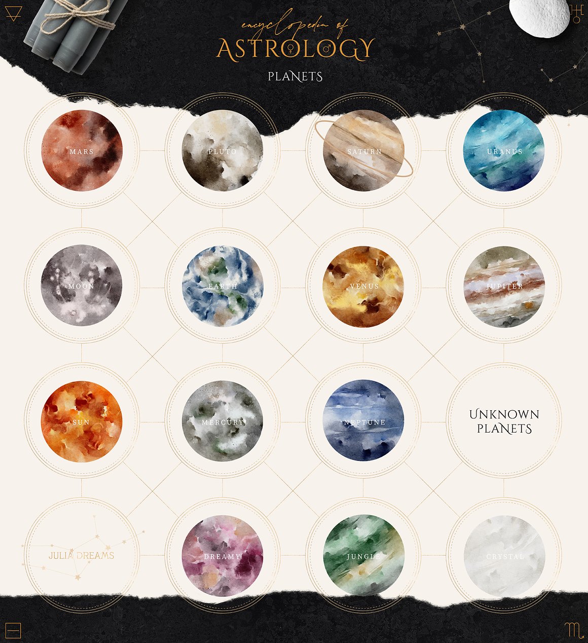 This encyclopedia of astrology includes all the basic elements for entering in the magical, mysterious and astrological world: watercolor crystals and gems, planets, zodiac symbols, constellations, moon phases, celestial maps, zodiac & plant signs, yoga poses, mandala, stars, ready to use prints and more…