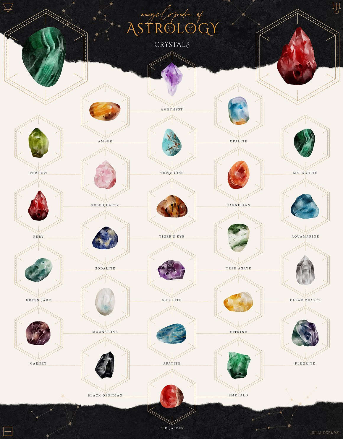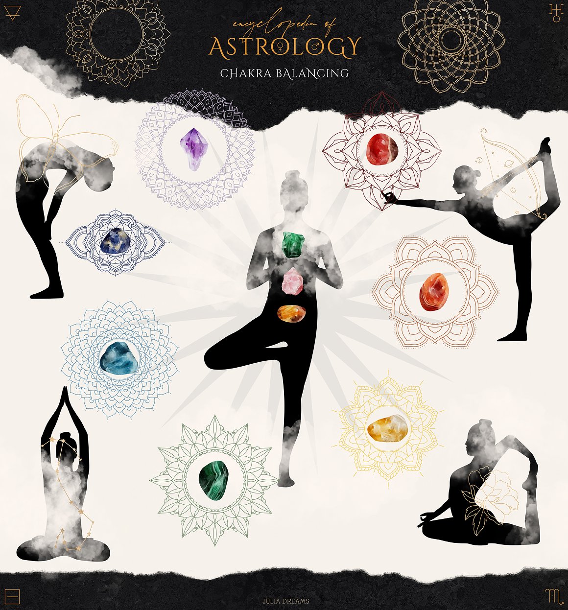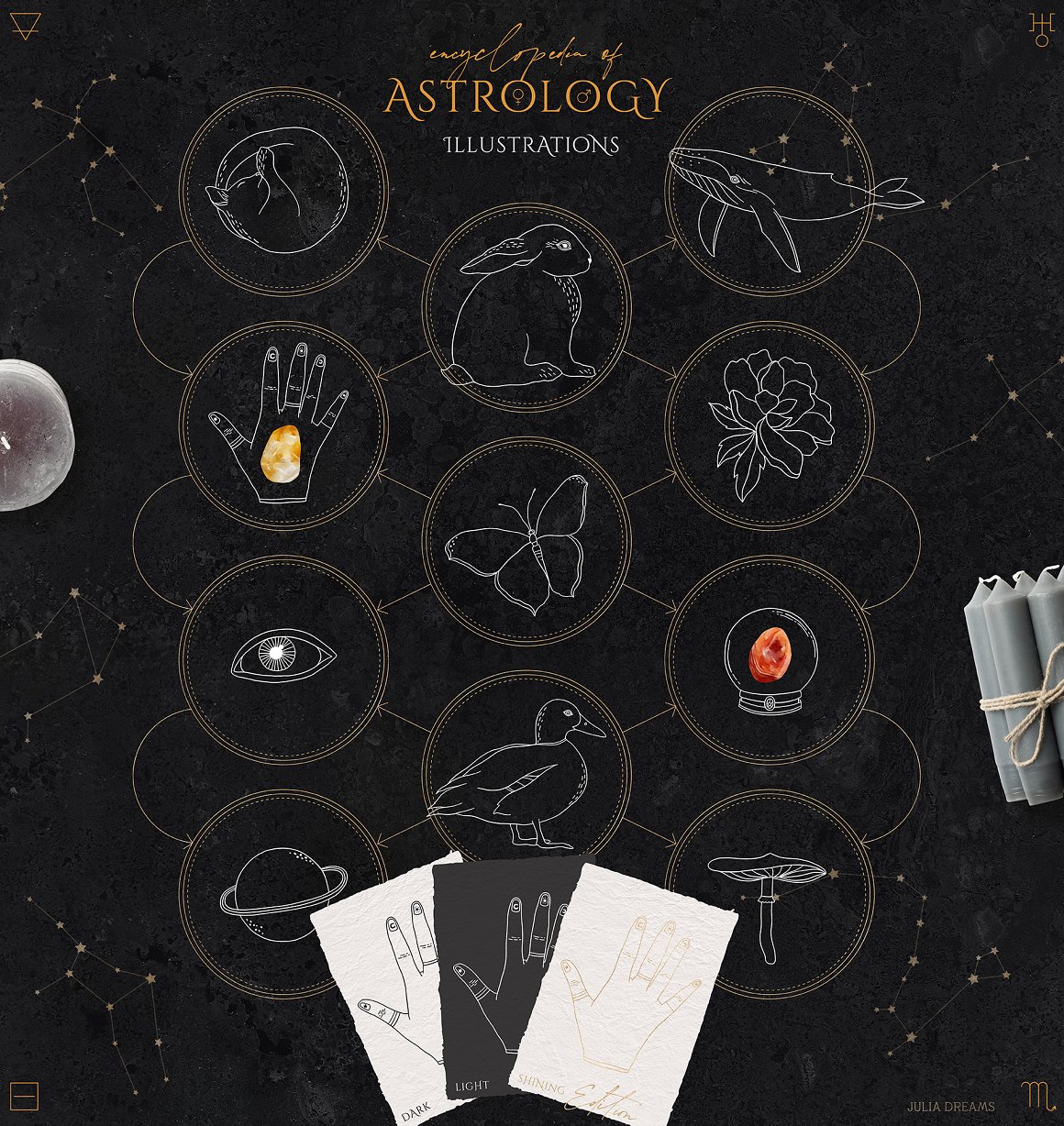 This encyclopedia of astrology includes all the basic elements for entering in the magical, mysterious and astrological world: watercolor crystals and gems, planets, zodiac symbols, constellations, moon phases, celestial maps, zodiac & plant signs, yoga poses, mandala, stars, ready to use prints and more…