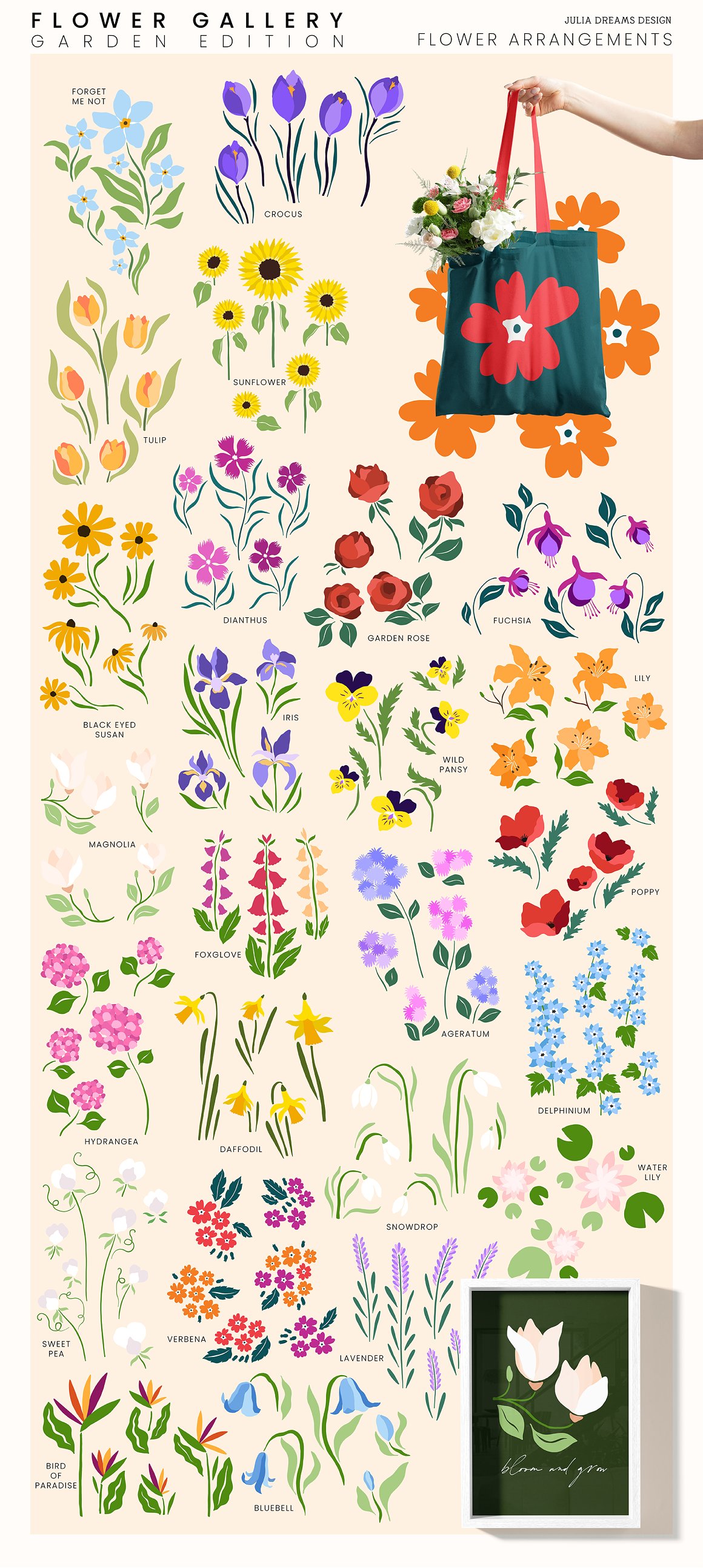 Summer has come and the flowering season has begun in many beautiful gardens. This inspired me to create a collection that includes 25 types of flowers: forget me not, snowdrop, wild pansy, fuchsia, bluebell, crocus, daffodil, poppy, black eyed susan, water lily, dianthus, sunflower, foxglove, sweet pea, lavender, verbena, iris, garden rose, lily, tulip, hydrangea, ageratum, delphinium, magnolia and bird of paradise.