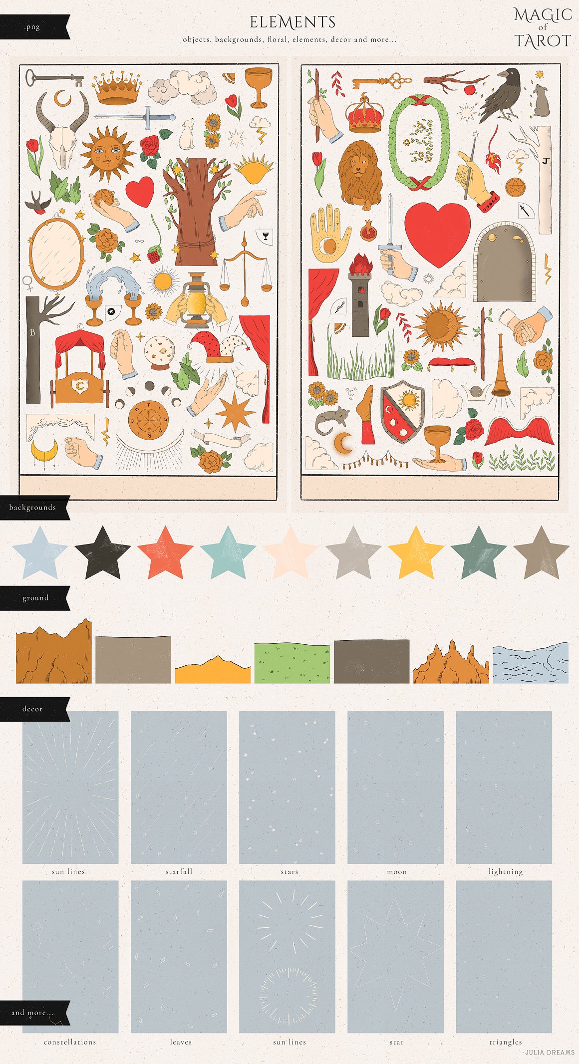 This is magical and mysterious a collection of tarot cards with a modern twist. One part of the project is the ready-to-use tarot cards, and the other is the individual elements that can be combined into posters, postcards, or other cards.