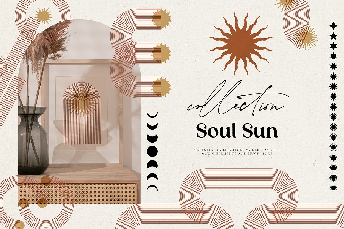 Soul Sun great for logo, posters, cards, branding, covers, gifts, social media accounts, wrapping paper, wallpaper, fabric, scrapbooking, stickers, sites, blogs, invitations and much more!