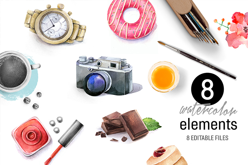 Set of watercolor icons. Hand drawn illustration. It can be used as a design of icons, posters, fabric, notebooks and so on. You will get: 8 JPEG files (3000×2834 px, 300 dpi), 8 PNG files (3000×2834 px, 300 dpi), 8 PSD editable files (3000×2834 px, 300 dpi), JPEG of watercolor elements (4000×4000 px 300 dpi).