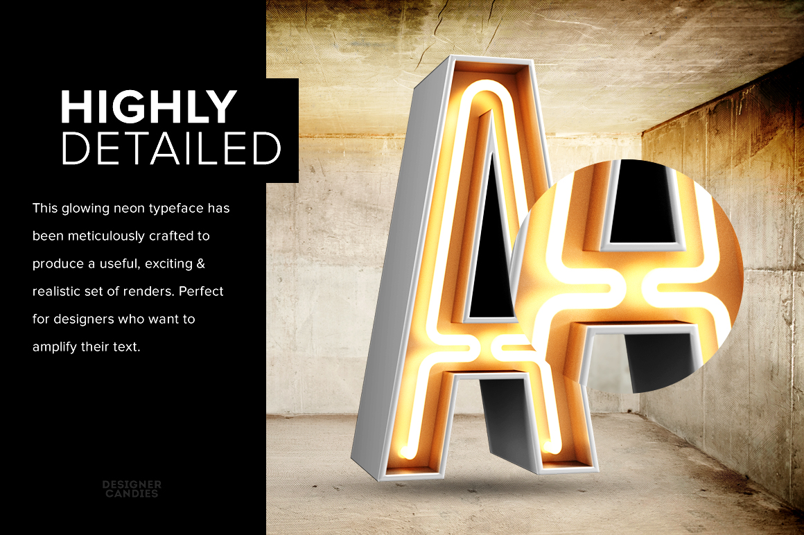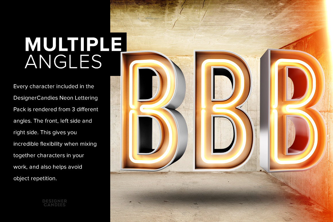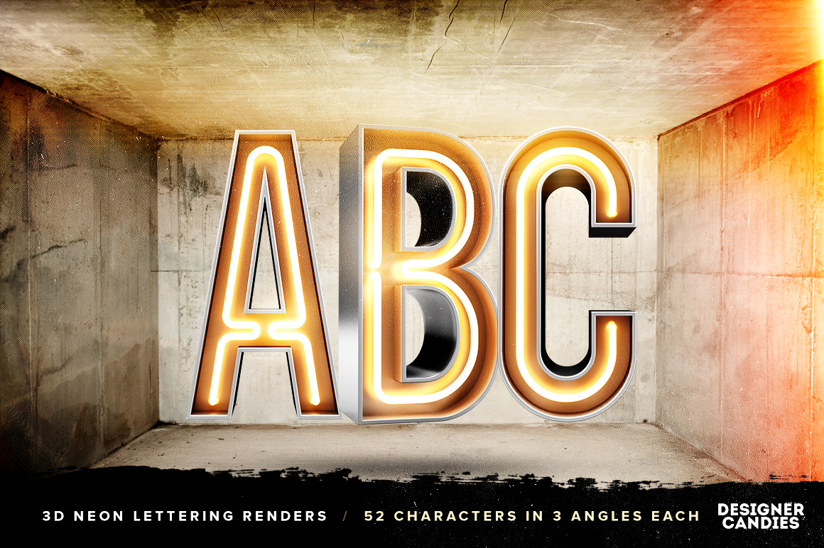 Incredible 3D lettering pack styled to look like realistic neon signage. Perfect for nightlife & music related design work. Each character comes as a Photoshop CS6 compatible 3D object & transparent .PNG render.