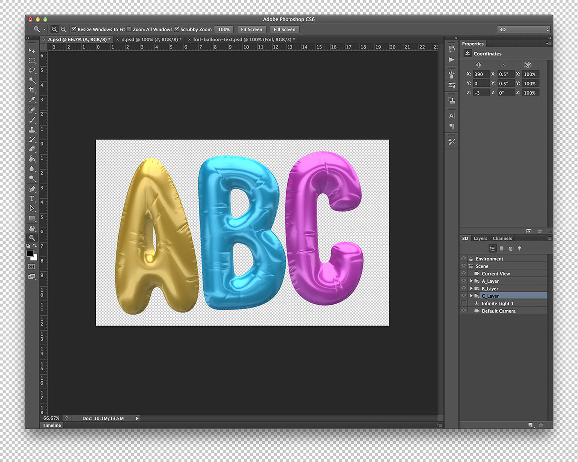 Fully Photoshop CS6+ Compatible 3D Lettering Pack, modelled to look like metallic foil balloons. Perfect for seasonal design projects, signage and simply jazzing up your work!