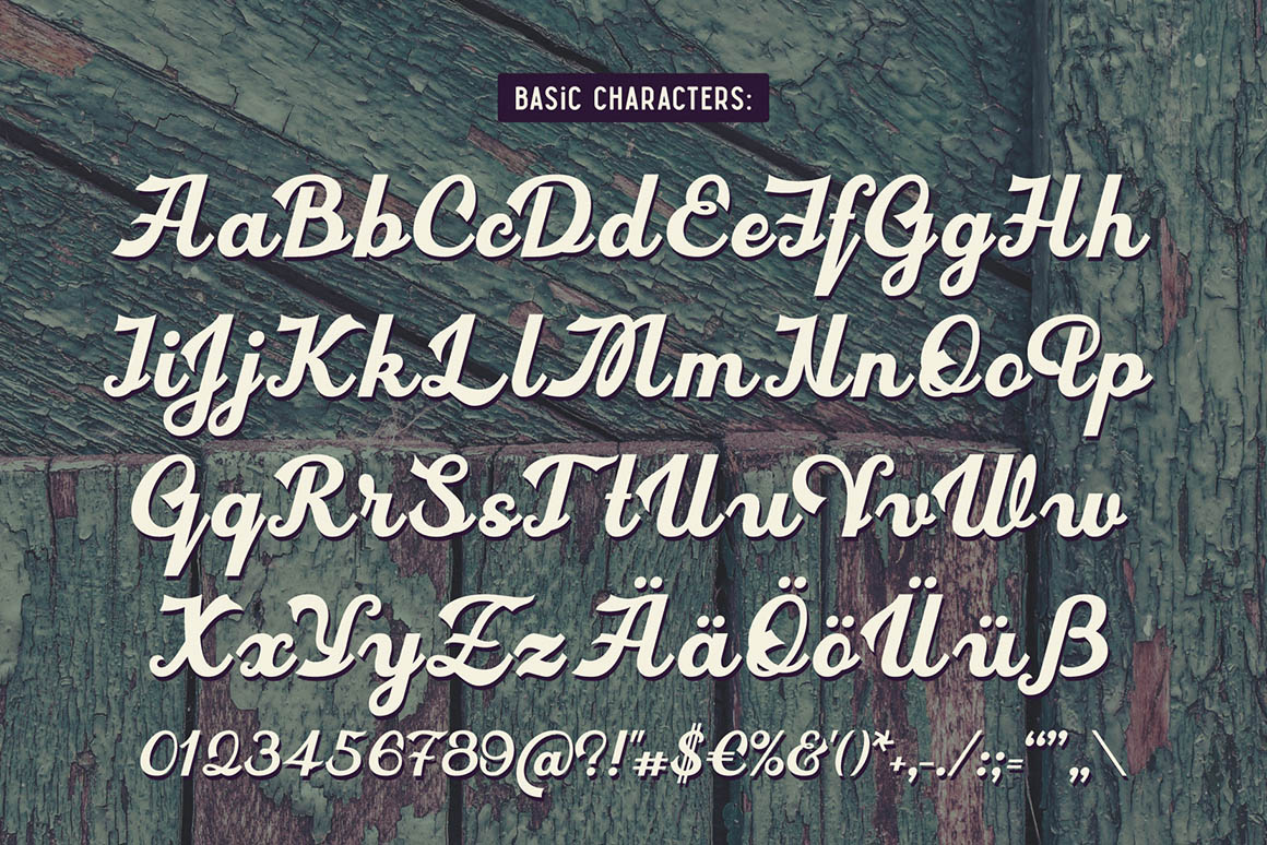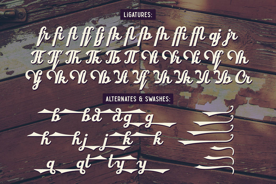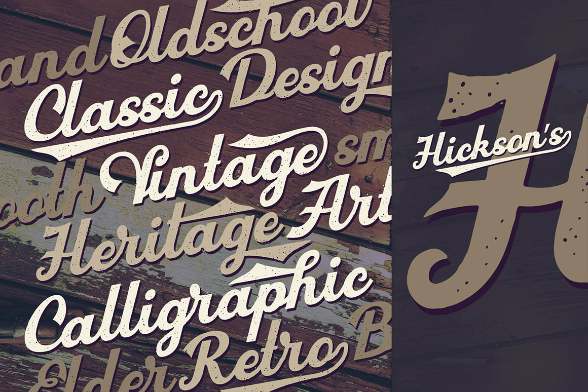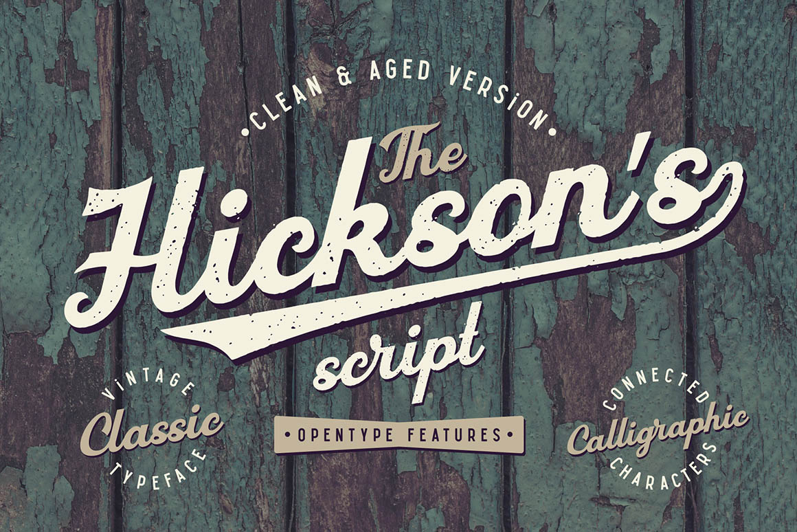 Hello! Introducing calligraphic vintage script named “Hickson’s”. It has a classic authentic look and two variations with clean and aged textured characters. This font has lots of OpenType features, like ligatures, swashes & stylistic alternates. As a bonus you will get 6 photos of an old wooden painted textures that you see on previews background.