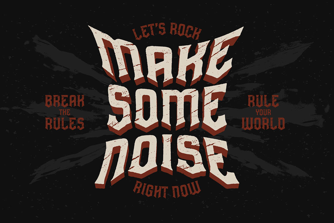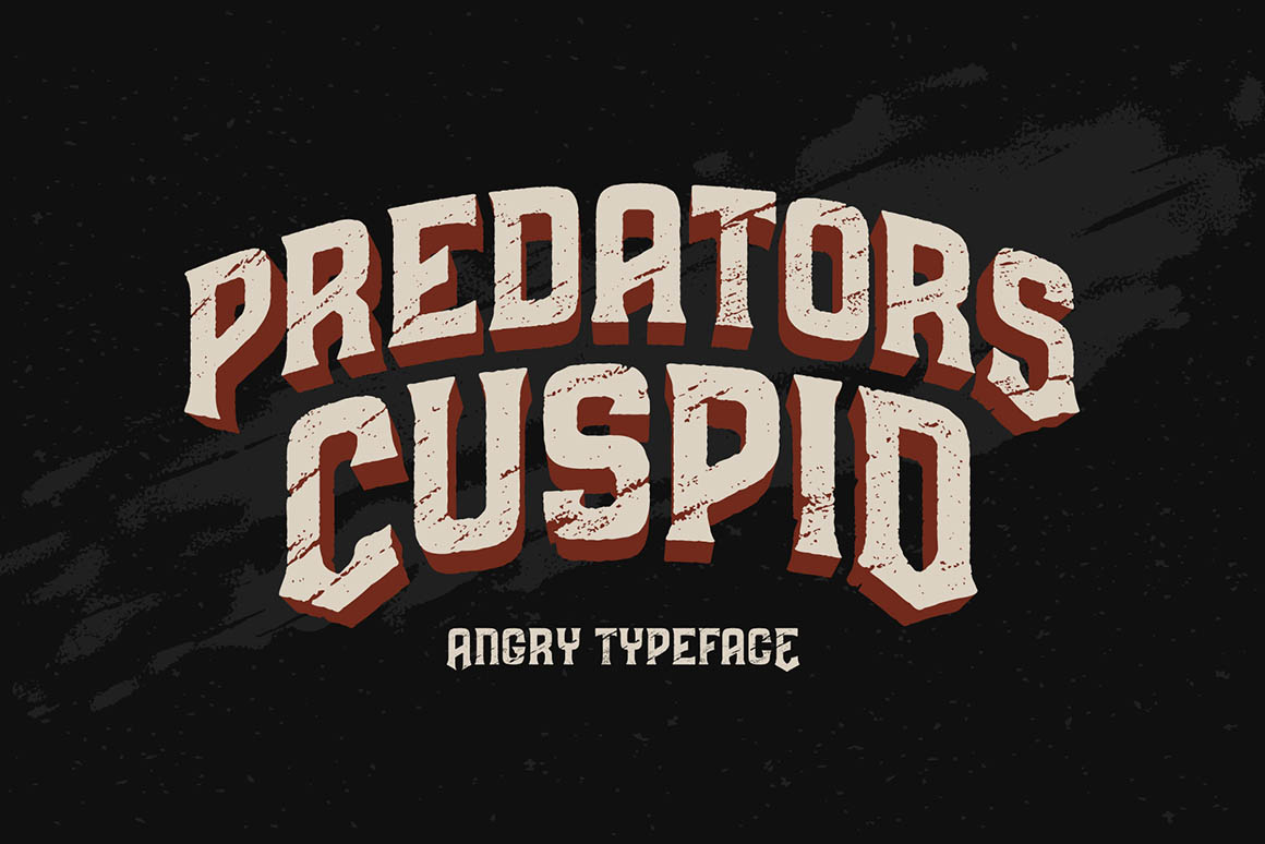Hi. Introducing a vintage angry look typeface named “Predators Cuspid”. It has a grunge scratched texture effect. Protruding “fangs” can be achieved by using a capital letters. As a bonus you will get a lettering posters (2nd & 4th screenshots) in fully editable AI & expanded EPS files.