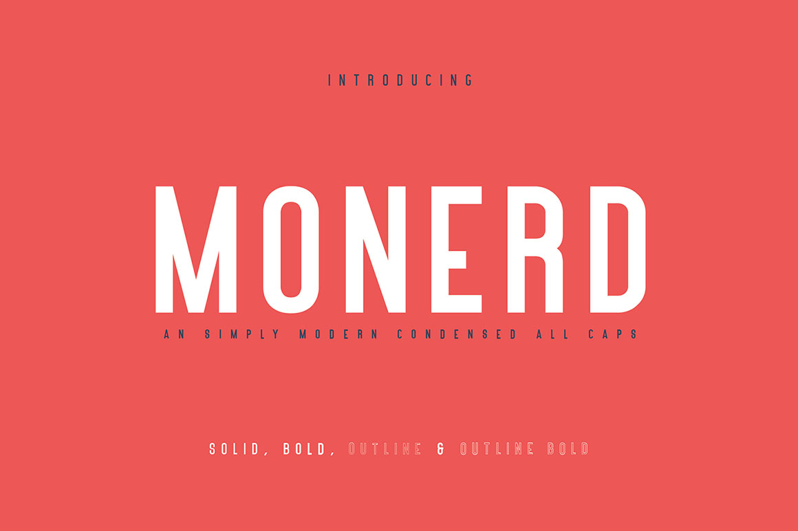 Monerd is a bold sans serif with outline, outline bold & solid font files. Monerd Sans is the improved of the previously SerronaTypeface. Monerd Sans is perfectly suited to branding, logos, magazines, films, website, headlines, titles, captions, games, apps, posters, t-shirts and more.