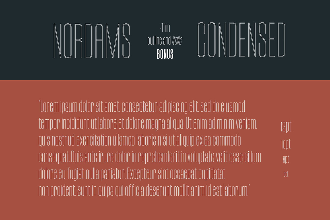 NORDAMS is a bold sans serif with Bold-Italic, Bold, Light-Italic, Light, Medium-Italic, Medium, Regular-Italic, Regular, Thin-Italic-Outline, Thin-Italic, Thin-Outline, Thin font files. NORDAMS is perfectly suited to branding, logos, magazines, films, website, headlines, titles, captions, games, apps, posters, t-shirts and more.