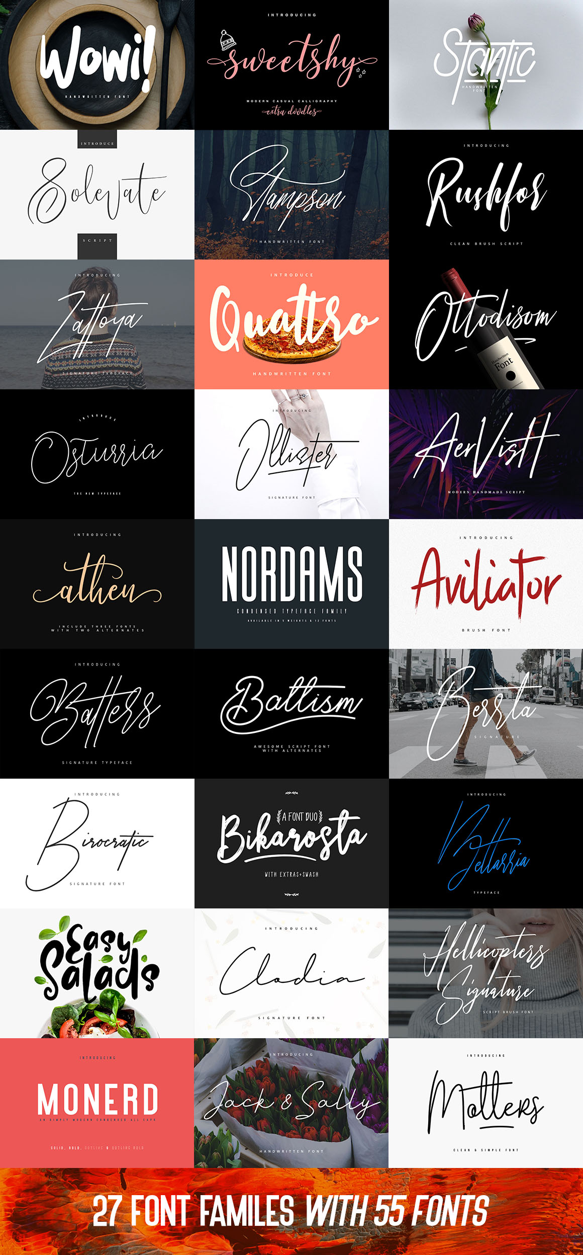 Need a creative & unique fonts for your new custom project? No problem at all 😉 You’ll find here 55 fonts in 27 font families with cool script & sans serif fonts!