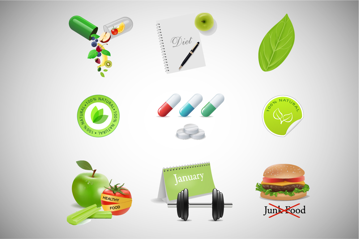 Collection of high quality realistic vector objects relating to fitness, diet and medicine. Text is in outlines. Ai and eps10 in the package.