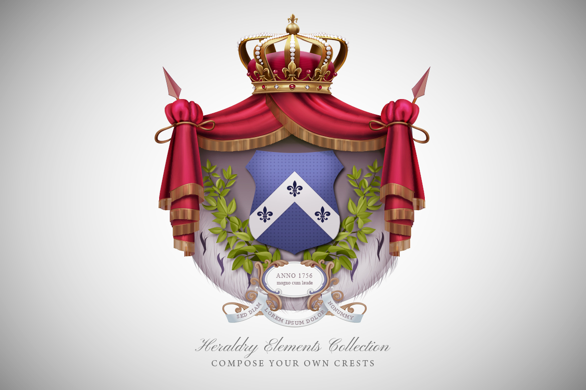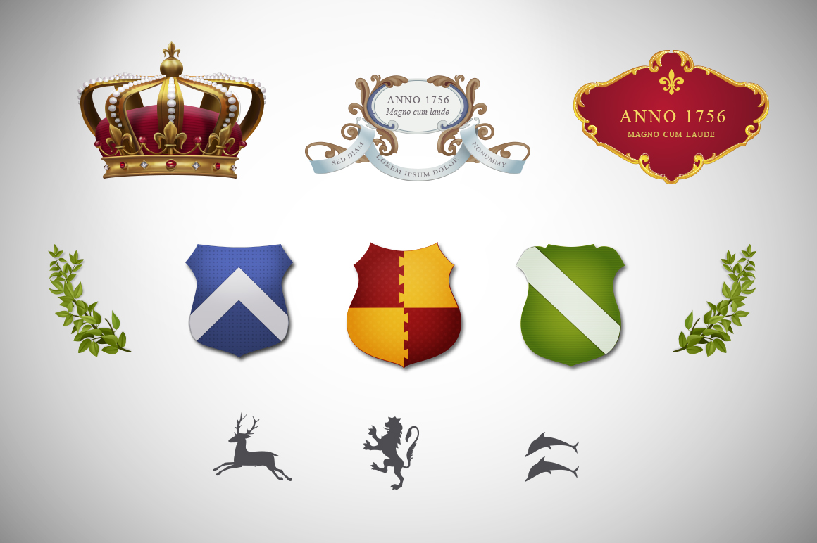 Collection of shields, laurel branches, ornate crests, heraldry shapes and crown. All elements are vector smart objects painted over and styled in Photoshop. You can mix and match them for making your own logo or coat of arms. Times New Roman font was used.
