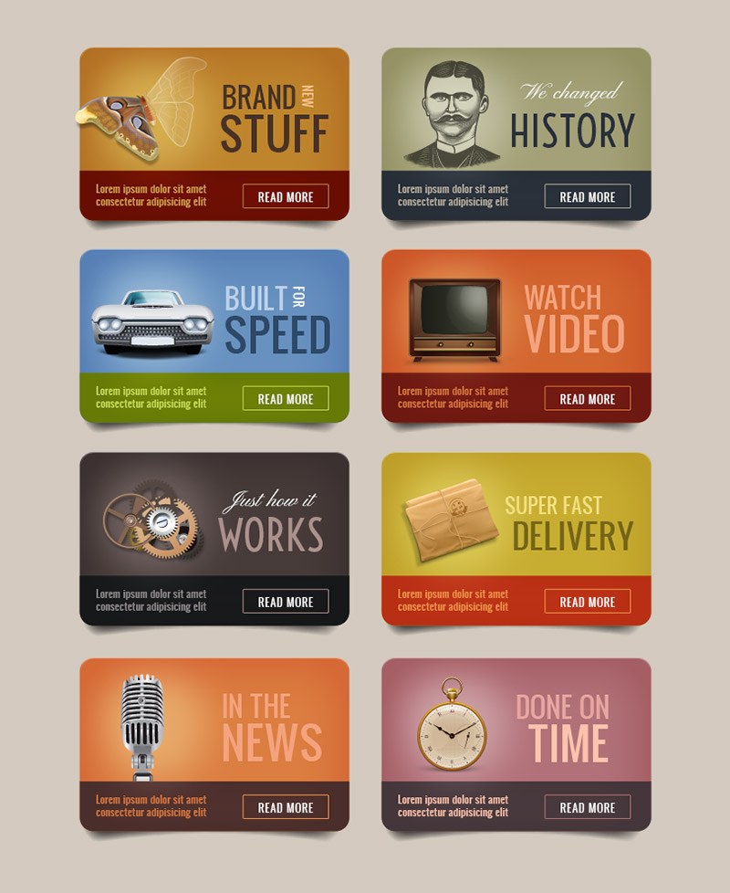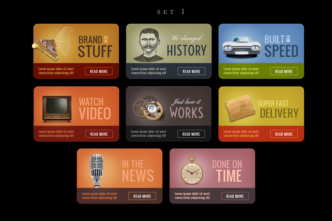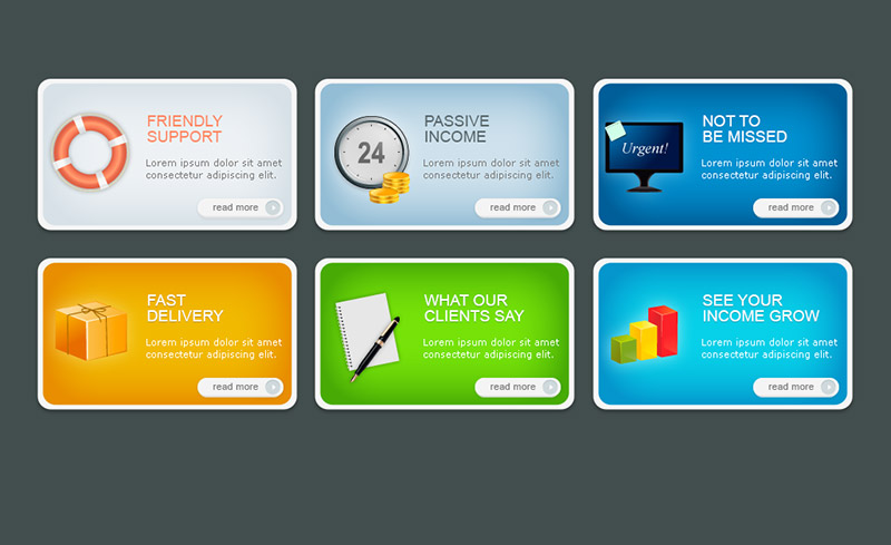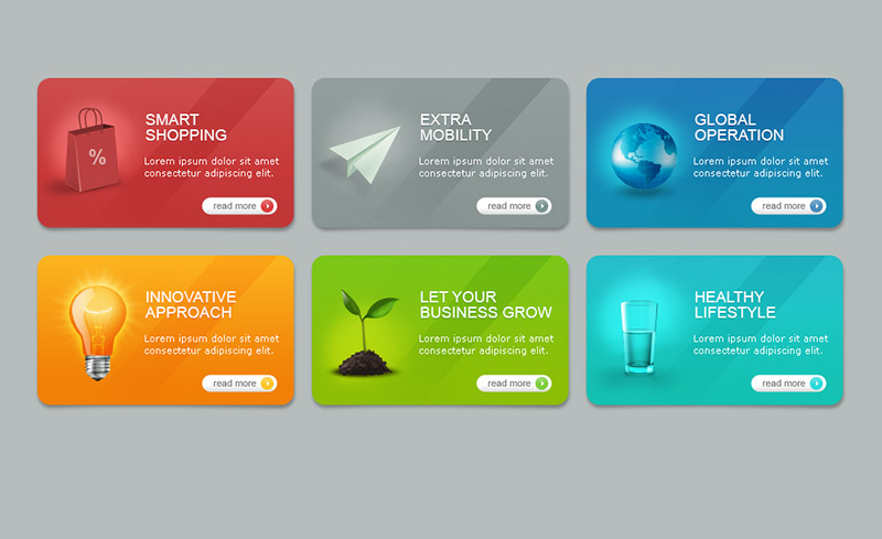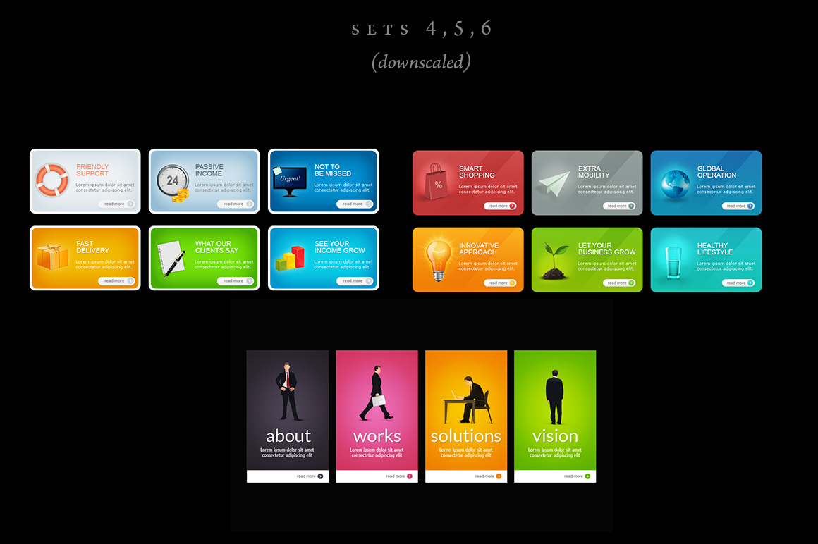 Huge collection of web boxes / banner templates depicting various concepts and ideas used in web design to outline advantages of product / service or simply attract attention to featured content sections like about us, contacts, delivery terms, etc. They are also useful for landing pages where you have call to action graphics. You may use these web boxes as is, or as icons or UI elements. Some icons are very detailed state-of-the-art illustrations that will make your message memorable. Set 4,5,6 are designed to easily fit 940px 12 column grid. Adobe Photoshop needed to edit these web boxes.