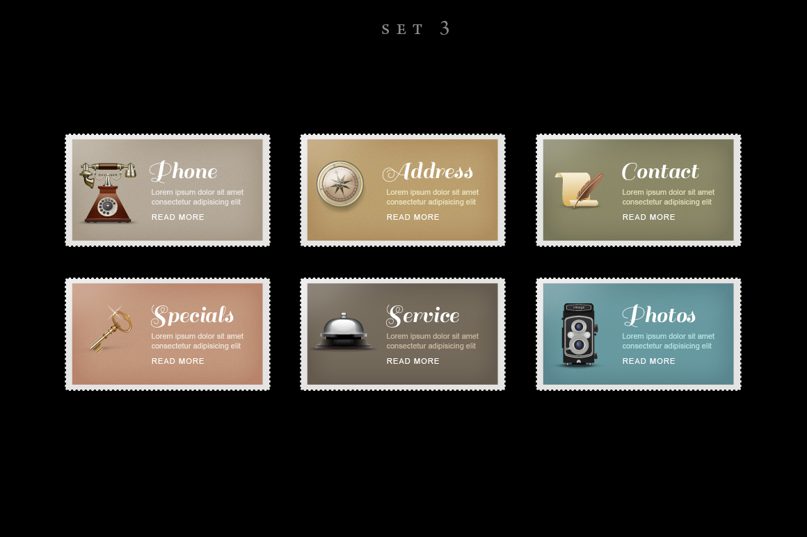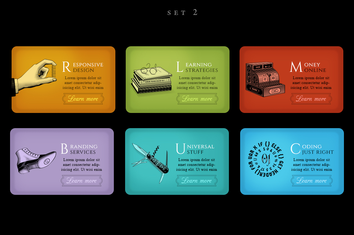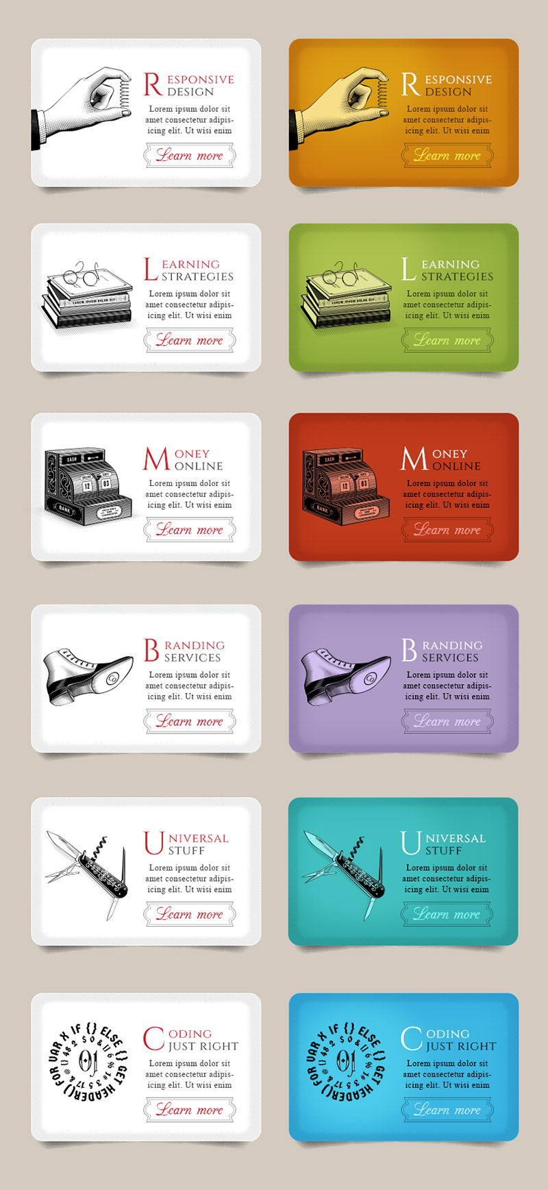 Huge collection of web boxes / banner templates depicting various concepts and ideas used in web design to outline advantages of product / service or simply attract attention to featured content sections like about us, contacts, delivery terms, etc. They are also useful for landing pages where you have call to action graphics. You may use these web boxes as is, or as icons or UI elements. Some icons are very detailed state-of-the-art illustrations that will make your message memorable. Set 4,5,6 are designed to easily fit 940px 12 column grid. Adobe Photoshop needed to edit these web boxes.