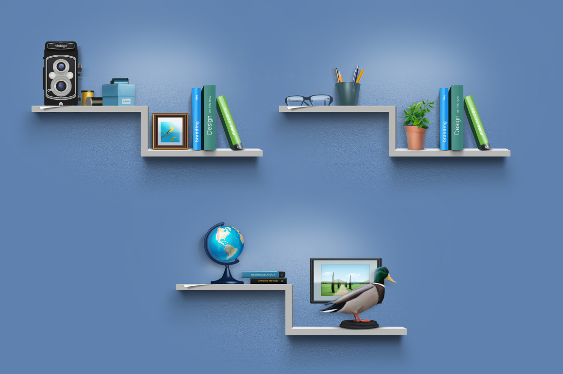 High quality objects with INSANE amount of details arranged as shelf stuff. Designer, photographer, book blogger can use this illustrations for ABOUT US page design. Or you can make back to school banners using the objects from this set. So what you get is: vintage camera, film rolls, framed pictures, books, globe, stuffed bird, glasses, pencils in a glass, flower in a pot. All pixel-perfect, hand-drawn, layered. NOTE that these things can not be up-scaled (except shelves – they are vector shapes).