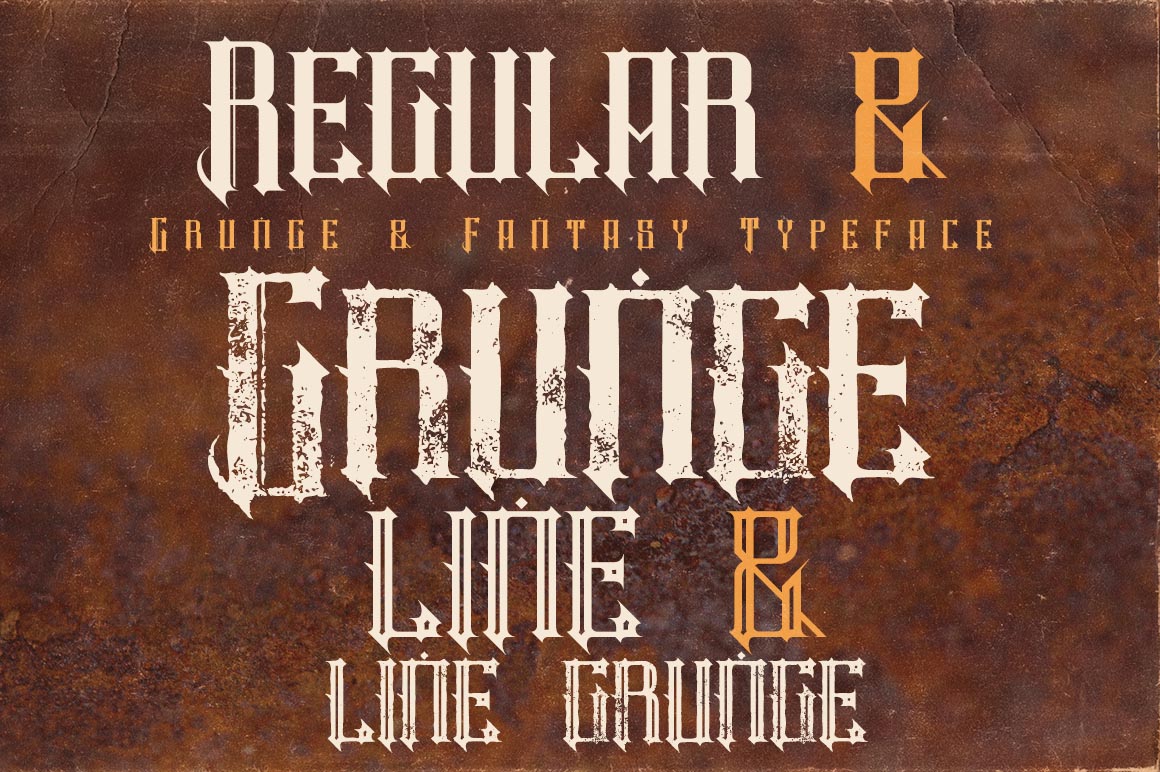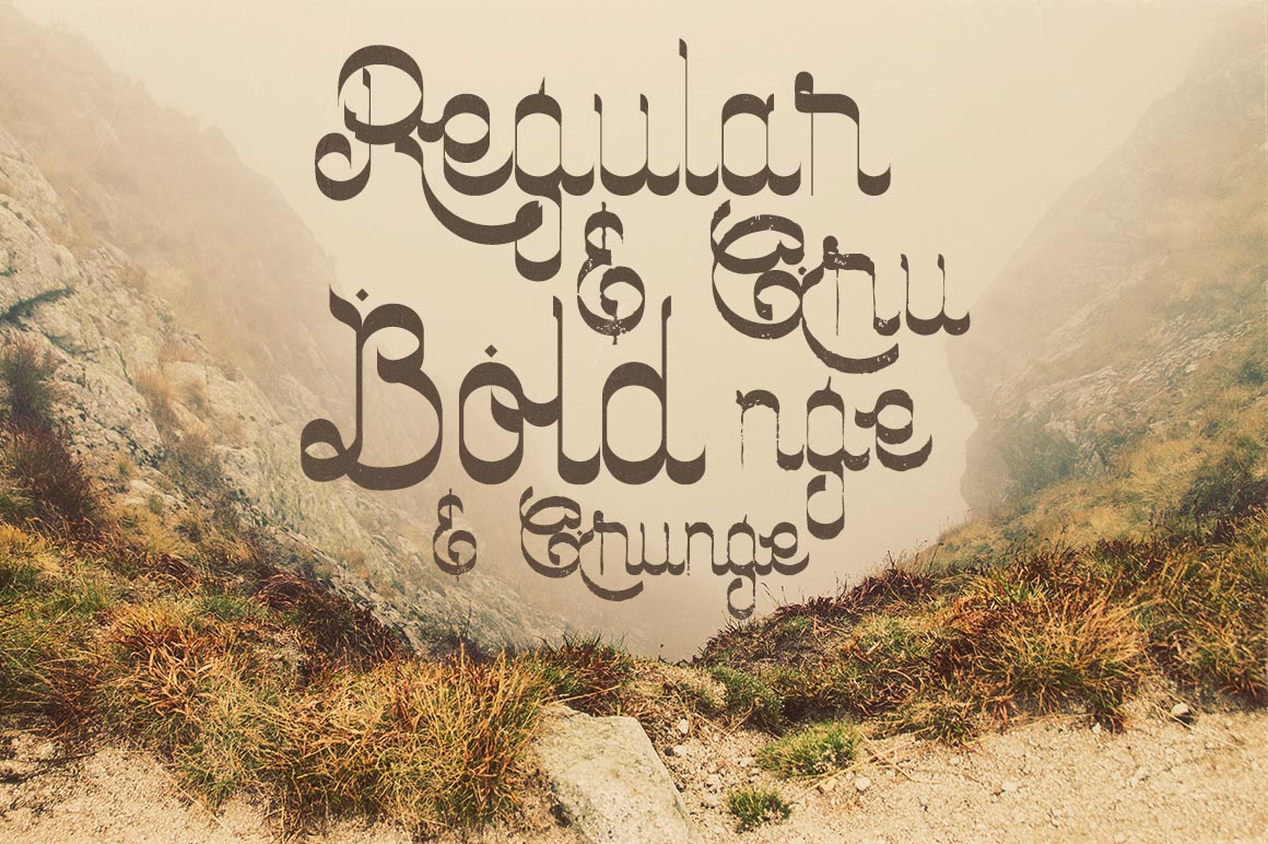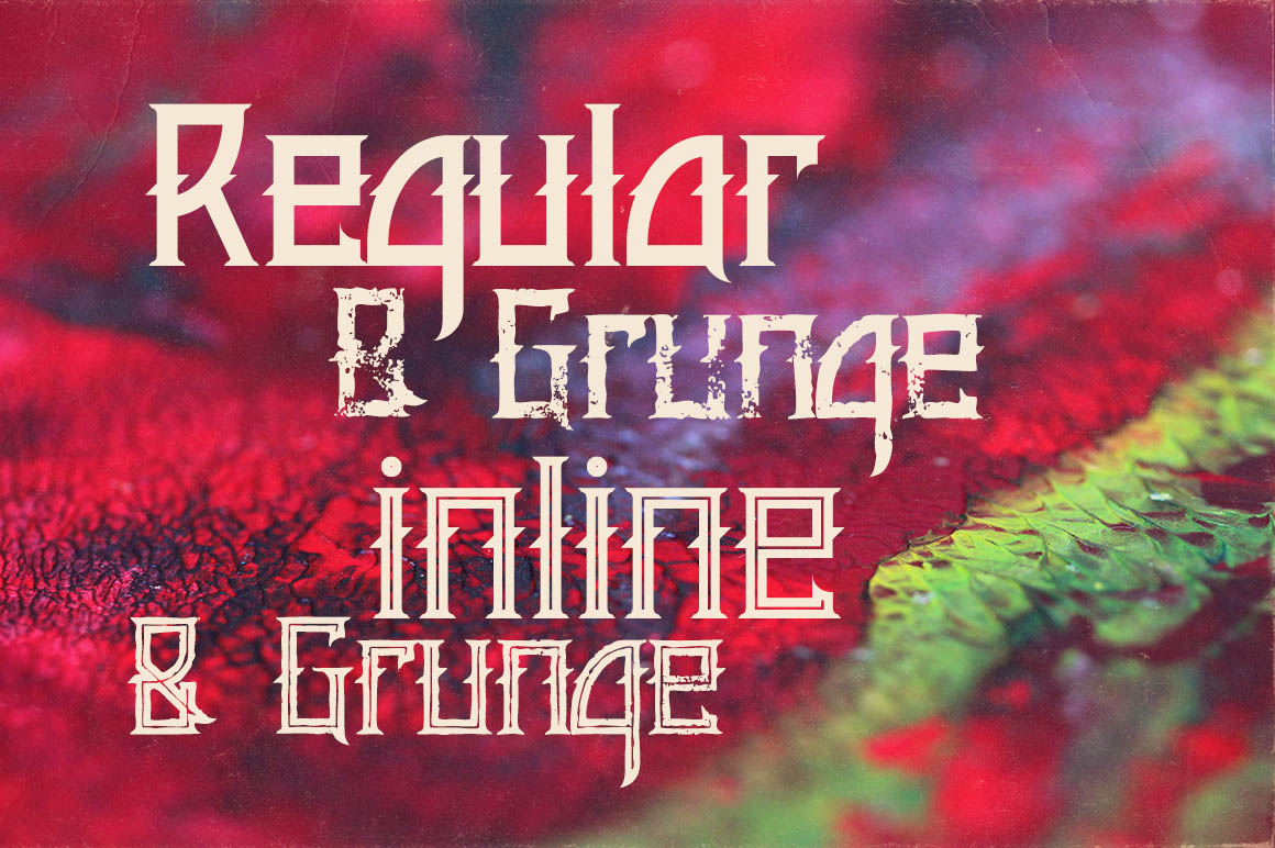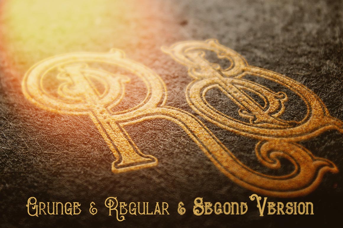 Unique vintage or fantasy style custom font with 4 styles: regular and grunge, inline and inline grunge