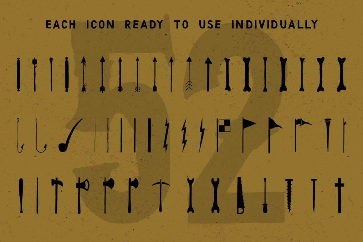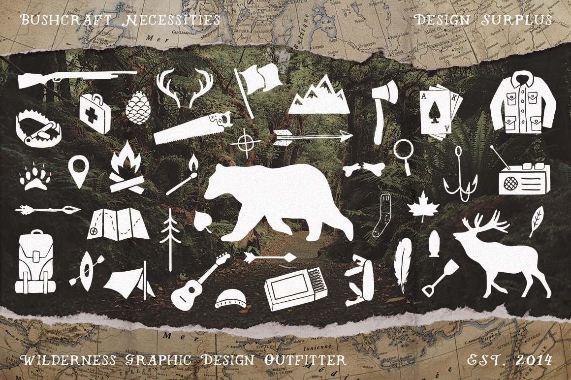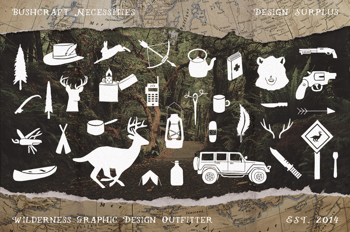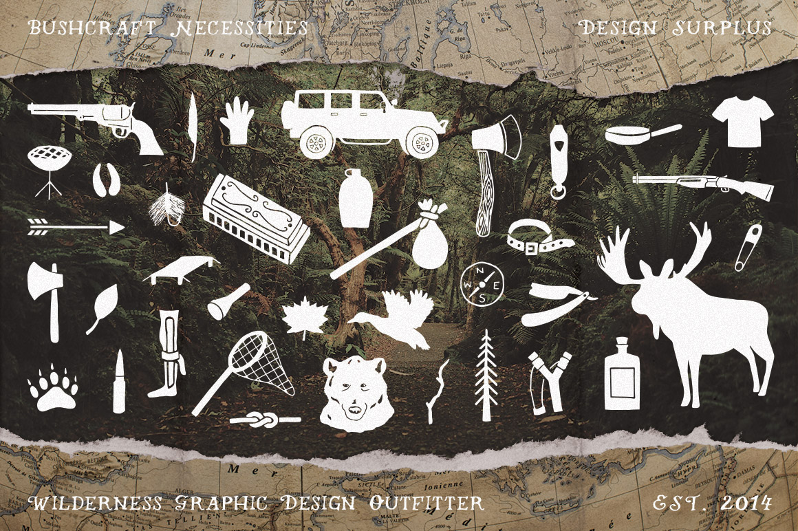 I present to you, Bushcraft Necessities, the first of 4 packs each tailored to prepare you, the designer, for a different climate. Everything needed to survive the bush can be found right here. Included in this pack: Over 100 hand drawn, bushcraft icons, 2 fully editable logos, All artwork in 4 formats (Ai, PSD, EPS, PNG). Great for: Logos, T-shirt Design, Branding, Greeting Card Design, Survival Infographics…